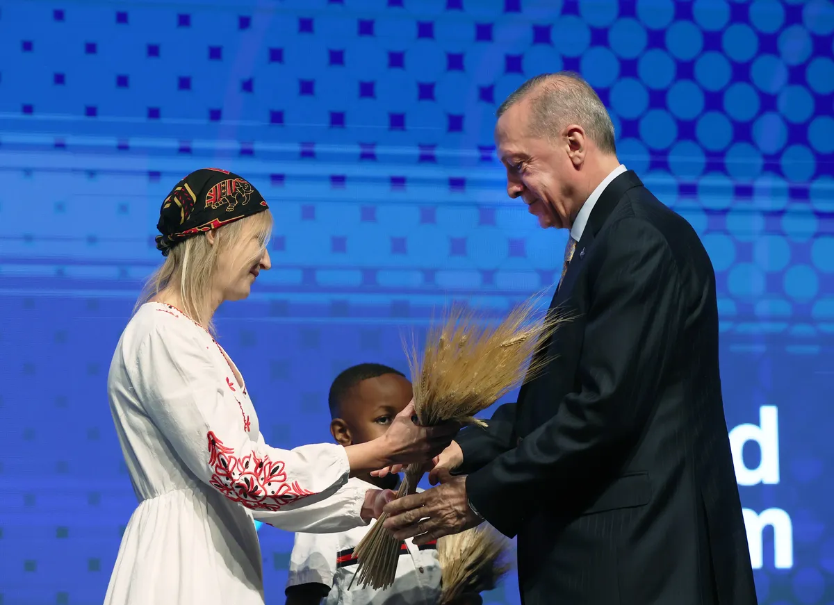 Реджеп Эрдоган (справа) получает пучок пшеницы от украинки и африканского ребенка во время Всемирного форума TRT, проводимого на тему «Картирование будущего: неопределенности, реалии и возможности» в Стамбуле, Турция, 9 декабря 2022 года. Фото: Getty Images