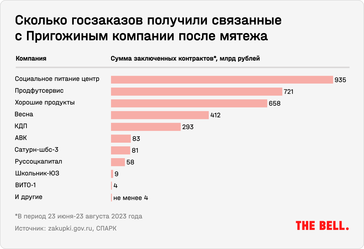 Эта часть бизнеса не перестала функционировать даже после мятежа. Начиная с 23 июня связанные с Пригожиным фирмы получили госзаказы на поставку продуктов и обеспечение питания от государственных структур на сумму не менее 3,6 млрд рублей, подсчитал The Bell. В эту цифру не входят военные госзаказы, которые государство с началом войны засекретило.