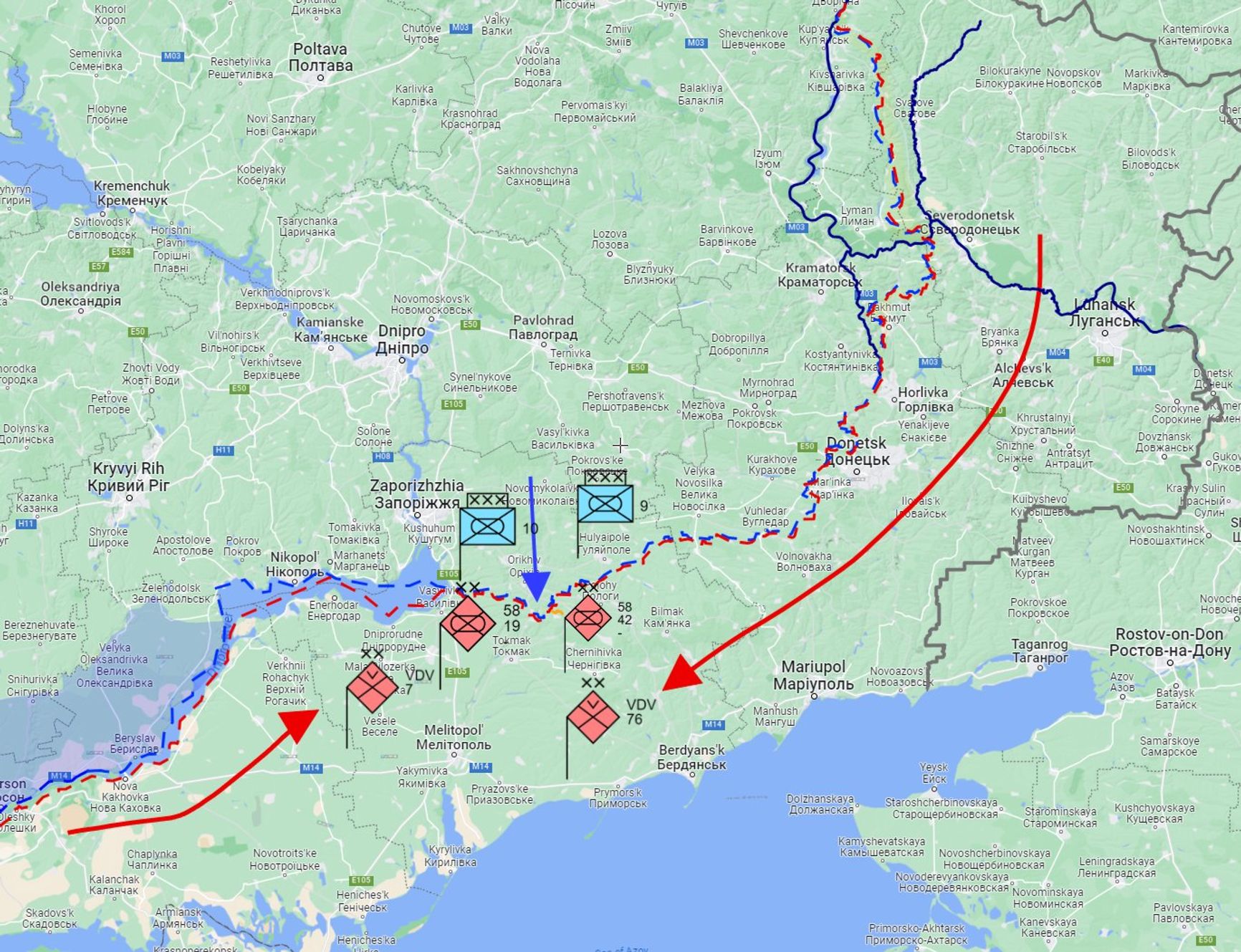 Аналитик Def Mon указывает на переброску резервов в район рядом с Работино с херсонского направления и из Луганской области. В течение последних нескольких месяцев ВС РФ постепенно выделяли резервы для обороны позиций к югу от Орехова. В течение последних нескольких недель из Херсонской области перебросили 7-ю десантно-штурмовую дивизию, а из Луганской области — 76-ю десантно-штурмовую дивизию.