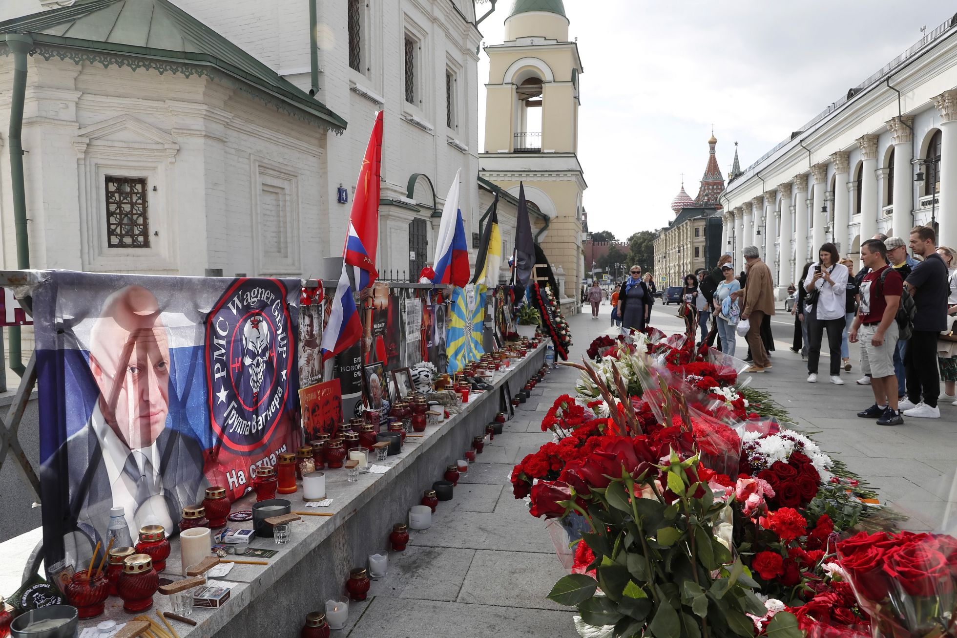 Максим Шипенков / EPA / Scanpix / LETA Импровизированный мемориал Евгению Пригожину на улице Варварка в центре Москвы. Самолет, принадлежащий основателю ЧВК Вагнера, разбился в Тверской области вечером 23 августа. Официальные причины крушения пока неизвестны. 27 августа СК РФ подтвердил гибель Пригожина. 28 августа перед воротами Серафимовского кладбища в Петербурге установили рамки металлодетекторов — издание «Фонтанка» предполагает, что это может быть связано с подготовкой к похоронам Пригожина и других погибших в авиакатастрофе