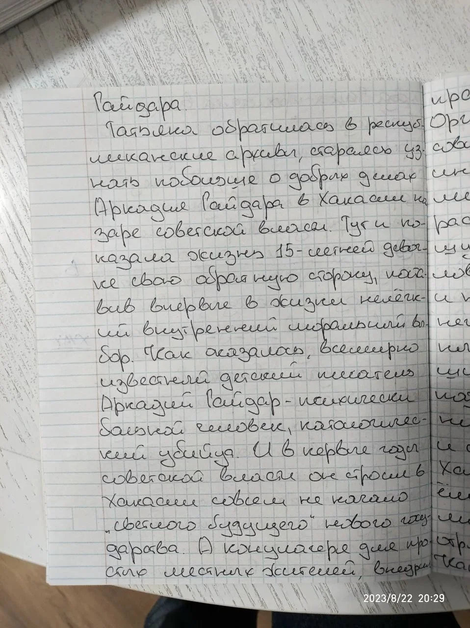Как выяснилось, Гайдар в первые годы советской власти строил в Хакасии совсем не «светлое будущее» нового государства, а концлагеря для простых местных жителей. Также он внедрил практику взятия в заложники. Устраивал массовые казни, в том числе женщин с маленькими ребятишками.