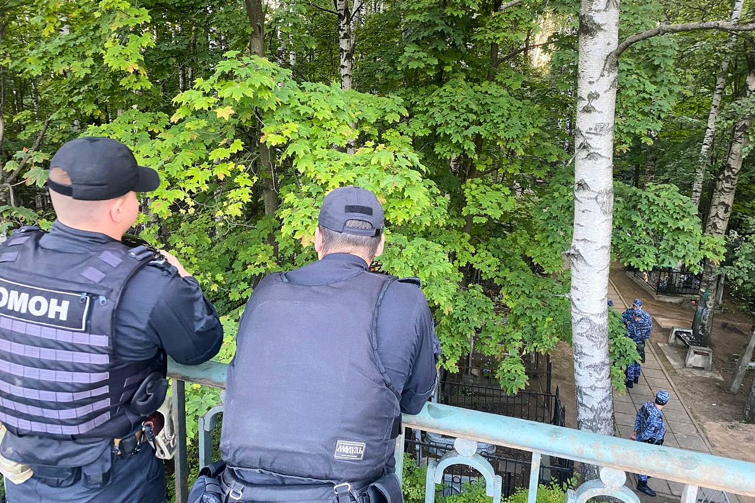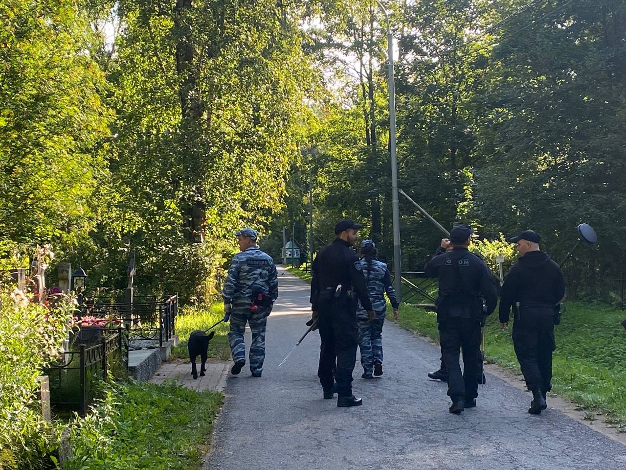 По территории всего кладбища с утра курсируют полицейские, ОМОНовцы и служба разминирования. К полудню они, устав, начинают общаться с собравшимися.