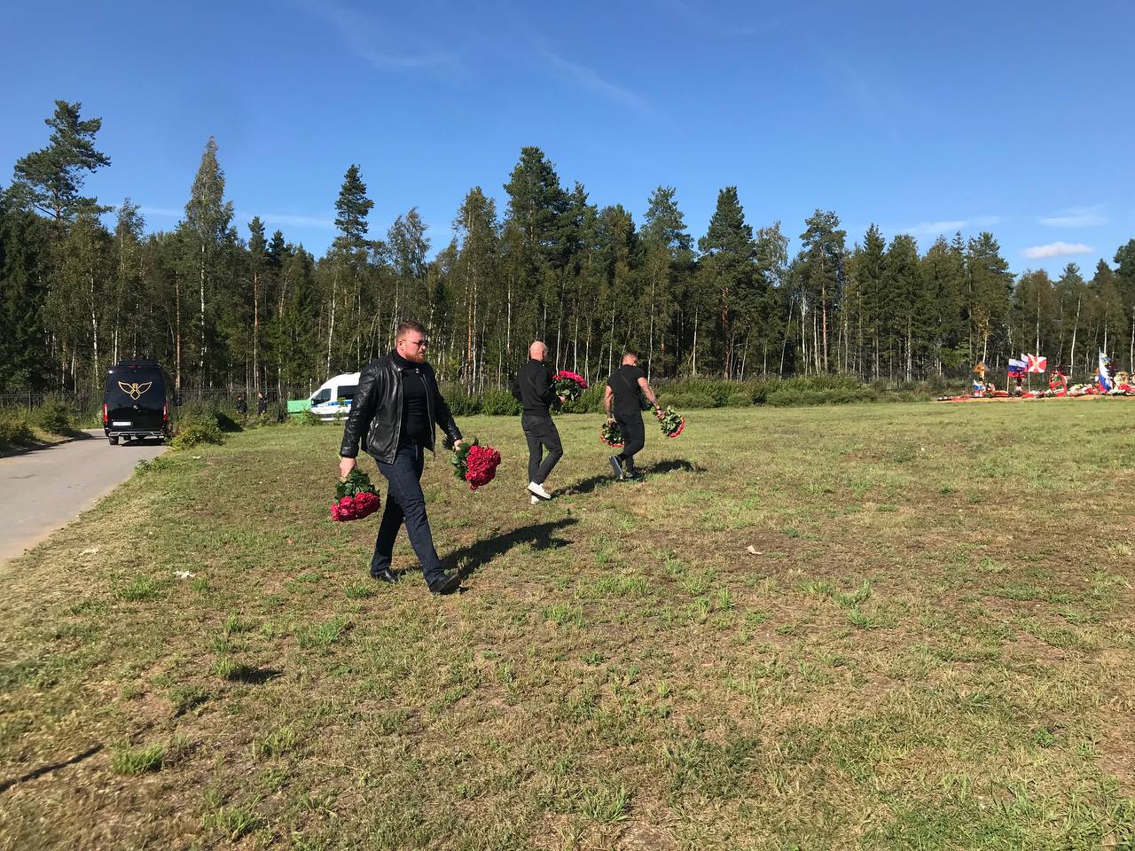 Из машин выходят крепкие мужчины в черном с цветами. Они оставляют гвоздики на могилах шести бойцов ЧВК «Вагнер» — и уезжают.