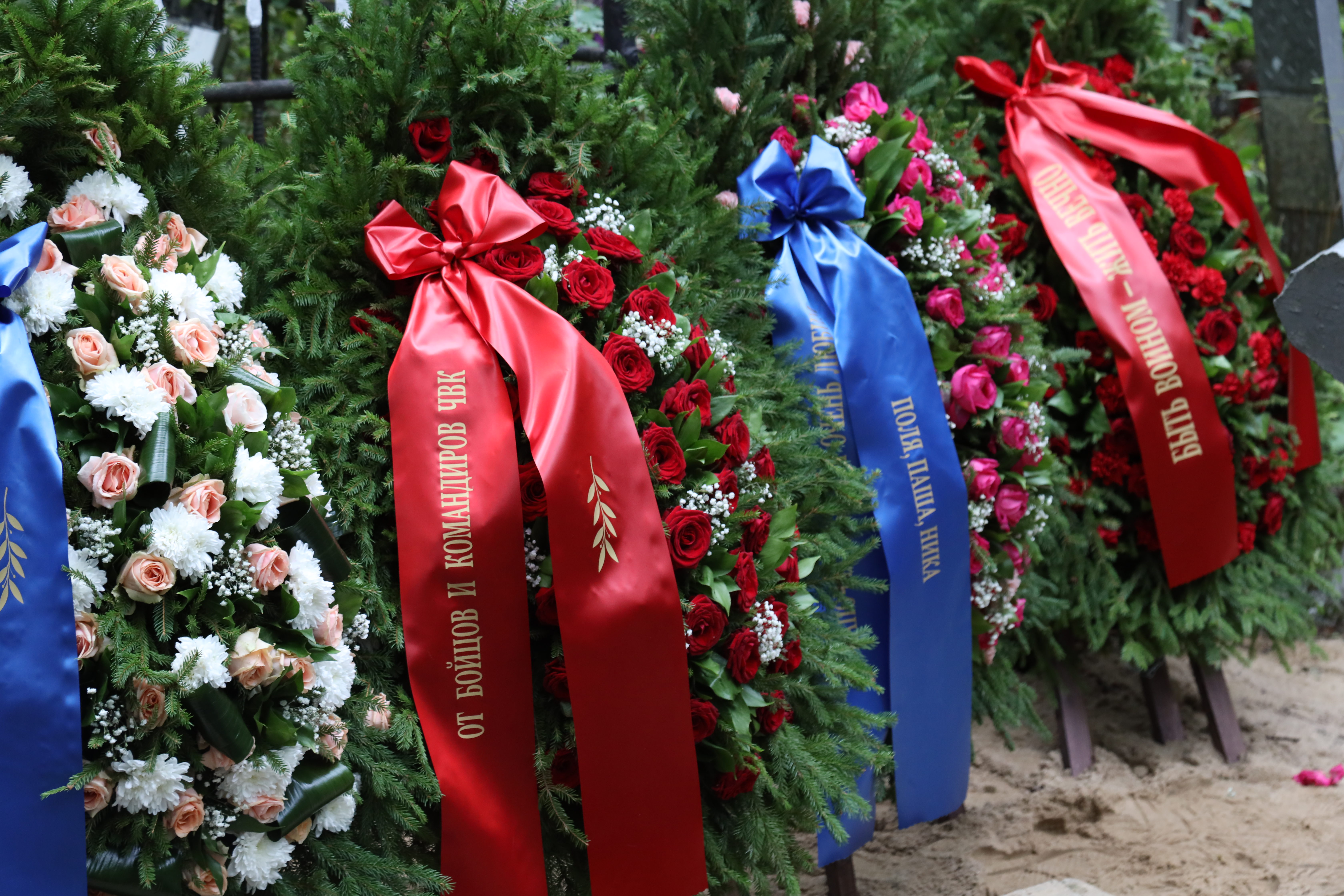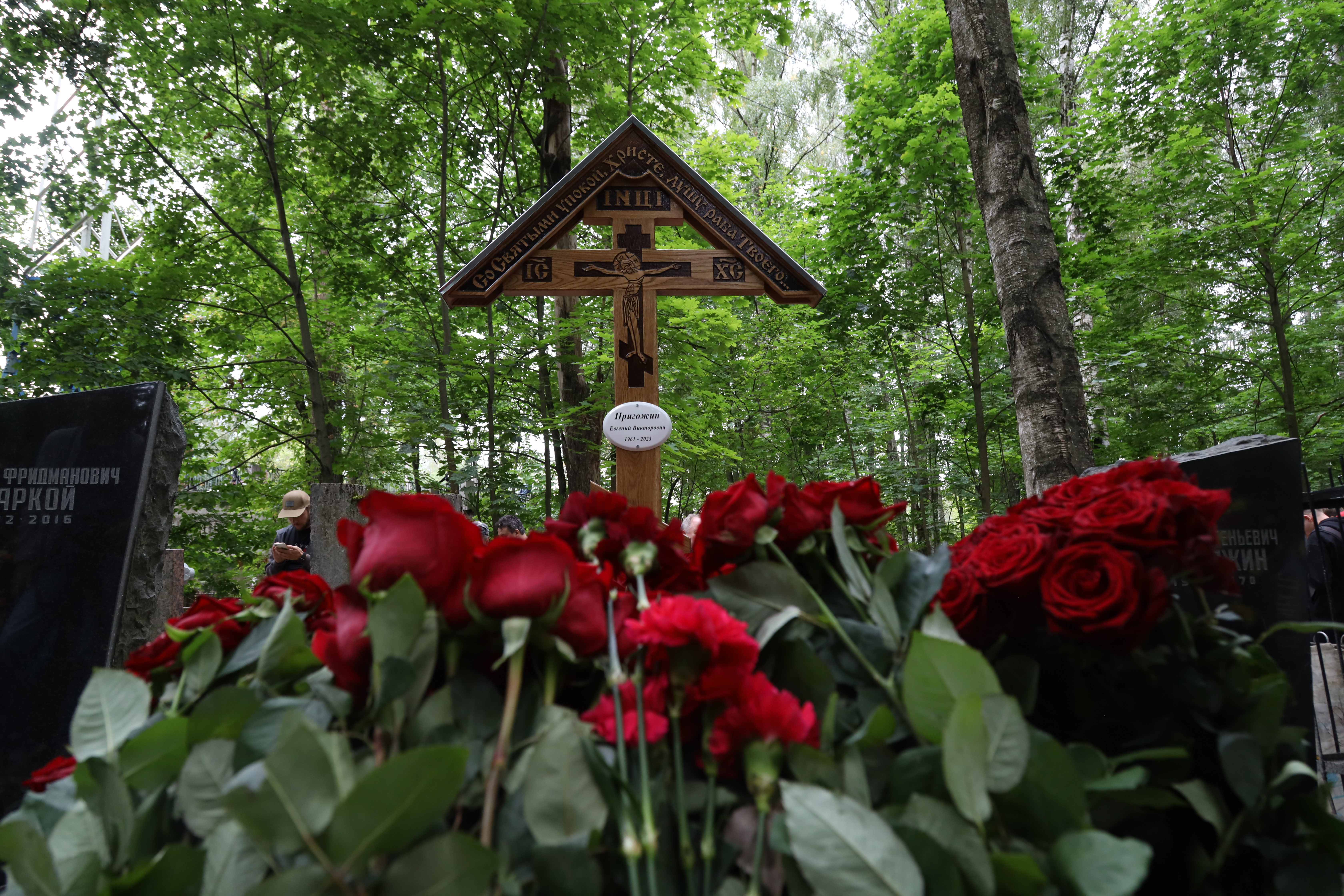 Евгений Пригожин был Героем России и по закону должен был быть похоронен с воинскими почестями. Были ли они ему оказаны, неизвестно. У деревянного креста поставили табличку с фрагментом стихотворения Иосифа Бродского "Натюрморт":