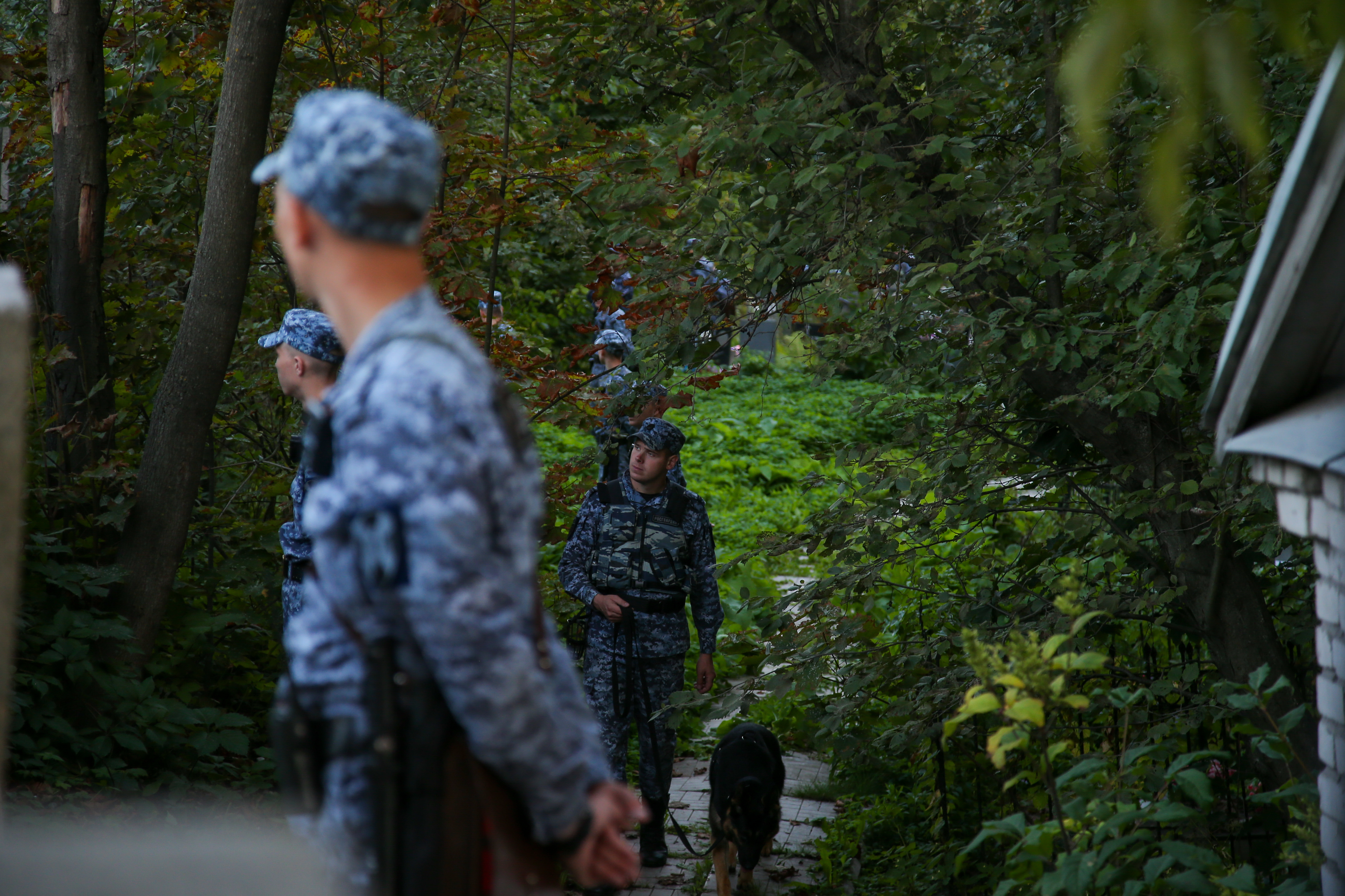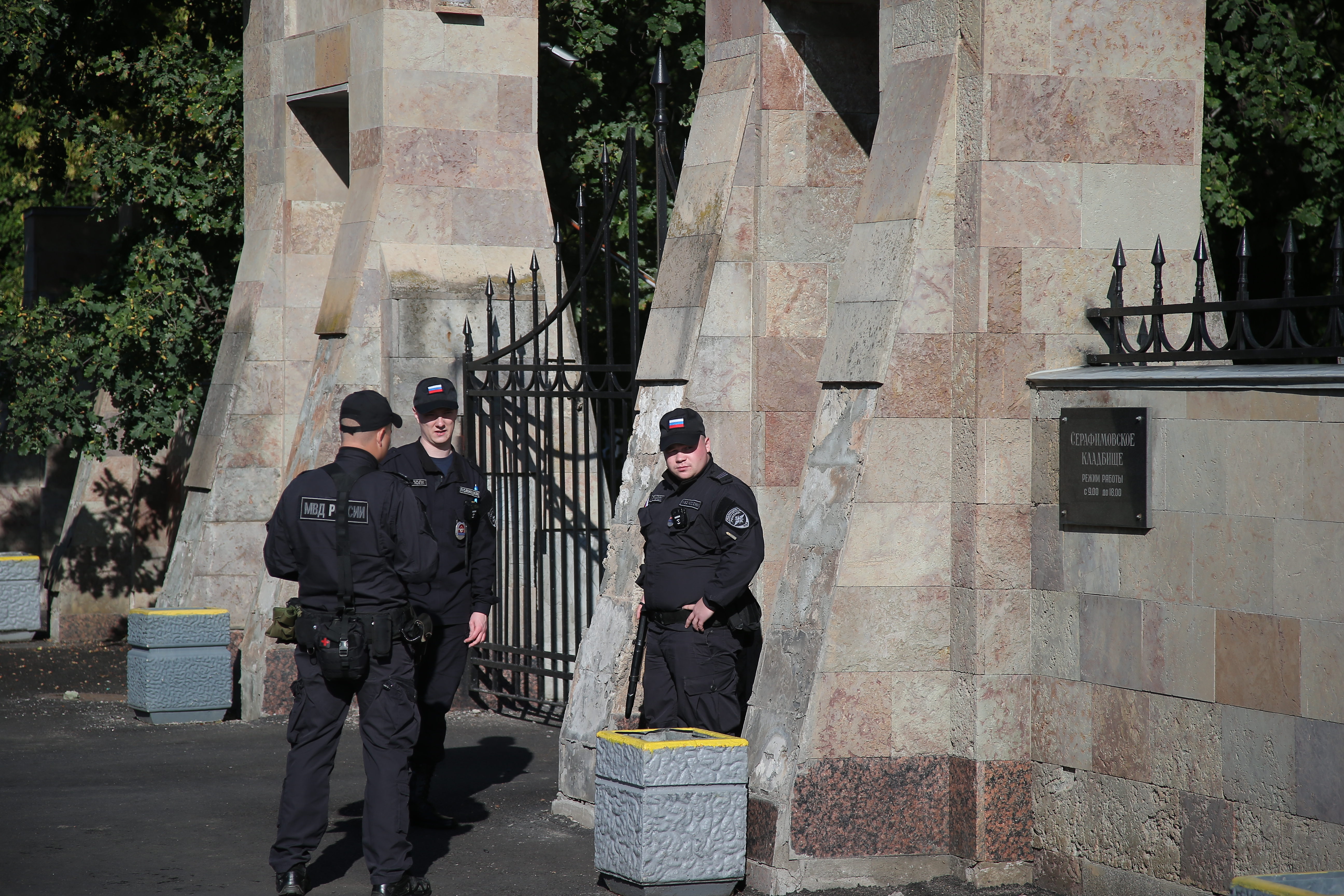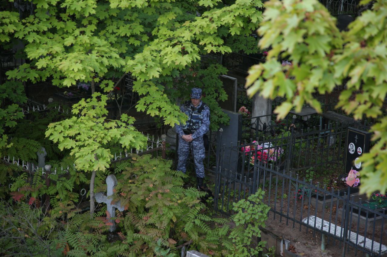 Периметр кладбища оцепили вооруженные сотрудники полиции: у них было не только обычное оружие, но и ружья против дронов.