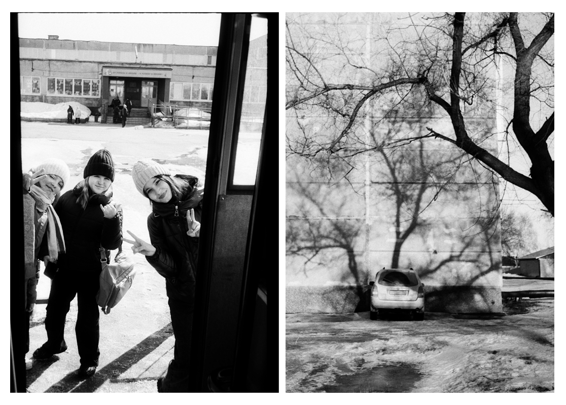 Слева: девятиклассницы идут после школы домой пешком и передают привет всем, кто едет на автобусе. Справа: тени на стене, ранняя веснаФото: Настя Субботина Снег