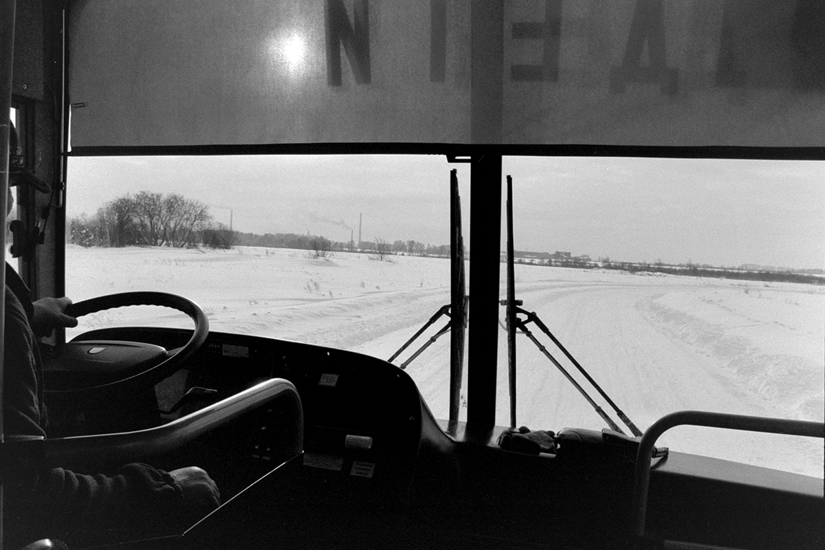 Вид на снежные поля вокруг Евсина из школьного автобусаФото: Настя Субботина На обратном пути сижу с водителем, который держит хозяйство в соседней деревне и любит пчел. Водитель школьного автобуса — мой большой друг.