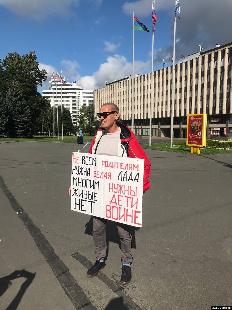 4 сентября он вышел к зданию мэрии города с плакатом "Не всем родителям нужна белая лада, многим нужны живые дети. Нет войне".