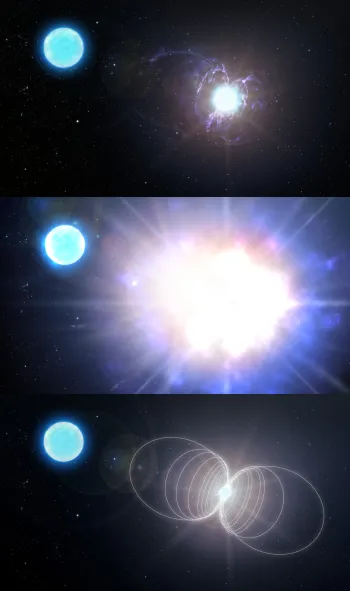 Почему у этой звезды столь сильное поле? Авторы работы предполагают, что данный объект образовался в результате слияния двух звезд меньшей массы. В результате слияния появляется образование с большим угловым моментом, а такая высокая скорость вращения как раз и способствует генерации сильного магнитного поля. Изначально система была тройной, при этом пара сливавшихся звезд находилась очень близко друг к другу, а третья, дожившая до наших дней, — в отдалении.