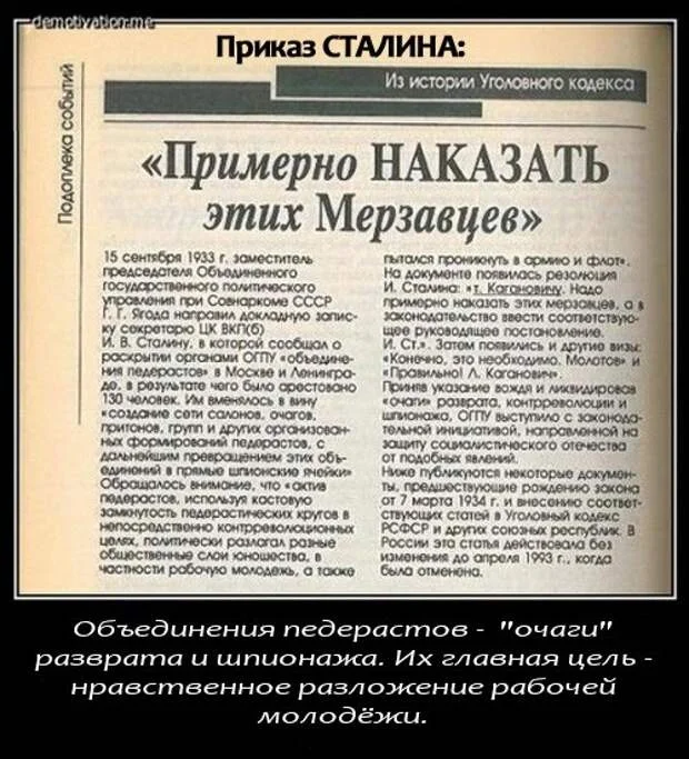 «Ликвидируя за последние годы объединения педерастов в Москве и Ленинграде, ОГПУ установило: 1. Существование салонов и притонов, где устраивались оргии; 2. Педерасты занимались вербовкой и развращением совершенно здоровой молодежи, красноармейцев, краснофлотцев и отдельных вузовцев. Закона, по которому можно было бы преследовать педерастов в уголовном порядке, у нас нет. Полагал бы необходимым издать соответствующий закон об уголовном наказании за педерастию». Это и было закреплено в статье 154-а УК РСФСР.Максим Горький с гордостью писал в статье «Пролетарский гуманизм», впервые опубликованной в «Известиях» 23 мая 1934 года: «…в стране, где мужественно и успешно хозяйствует пролетариат, гомосексуализм, развращающий молодежь, признан социально преступным и наказуемым, а в «культурной» стране (имеется в виду Германия) великих философов, ученых, музыкантов он действует свободно и безнаказанно. Уже сложилась саркастическая поговорка: «Уничтожьте гомосексуалистов — фашизм исчезнет».