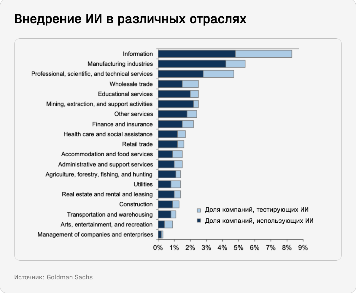 Внедрение новых технологий может быть неравномерным. Наибольшую выгоду от внедрения ИИ, вероятно, получат компании, которые нанимают большое количество работников, занимающихся умственным трудом, — например, из сферы финансов и IT, отмечают в GS. Опросы американского бизнеса в целом подтверждают, что компании в этих секторах до сих пор гораздо чаще внедряли или тестировали ИИ (см. график ниже).