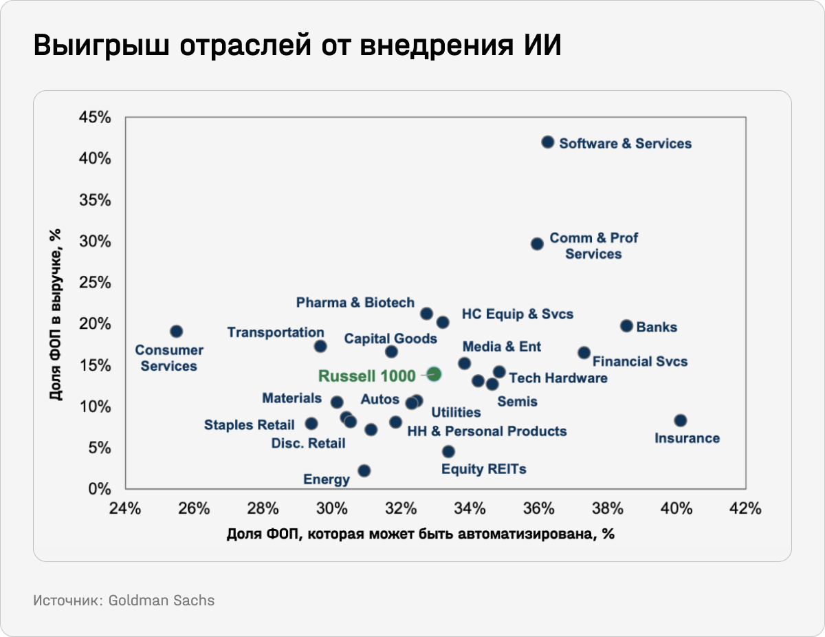 Рассчитали долю фонда оплаты труда (ФОП), которую можно сократить благодаря внедрению ИИ. Для этого они использовали базу данных Occupational Information Network, которая классифицирует все виды профессий по семи уровням сложности. Экономисты GS считают, что ИИ способен автоматизировать профессии до 4-го уровня сложности включительно. Далее они сопоставили это с данными о профессиях сотрудников компаний. Медианная доля ФОП для компаний индекса Russell 1000, который ИИ может позволить сократить, равен 24%.