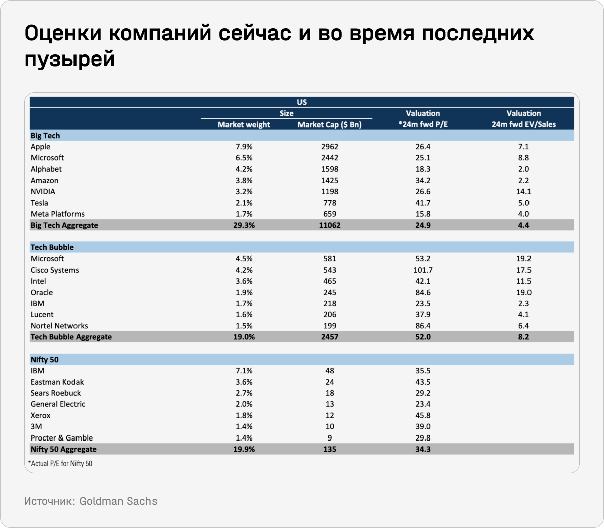 Но сейчас очевидные бенефициары внедрения ИИ стоят гораздо дешевле, чем аналогичные компании в прошлом. Семь крупнейших технологических компаний США, которые часто называют бенефициарами ИИ (Apple, Microsoft, Alphabet, Amazon, Nvidia, Tesla, Meta) сейчас в среднем торгуются с отношением цены к ожидаемой в ближайшие 24 месяца прибыли (24m. fwd P/E) в 25, а показатель EV/Sales для них составляет 4,4. Для сравнения, на пике пузыря доткомов эти показатели составляли 52 и 8,2 соответственно. У ведущих компаний из пузыря Nifty 50 в конце 1960-х годов коэффициент P/E превышал 34x.