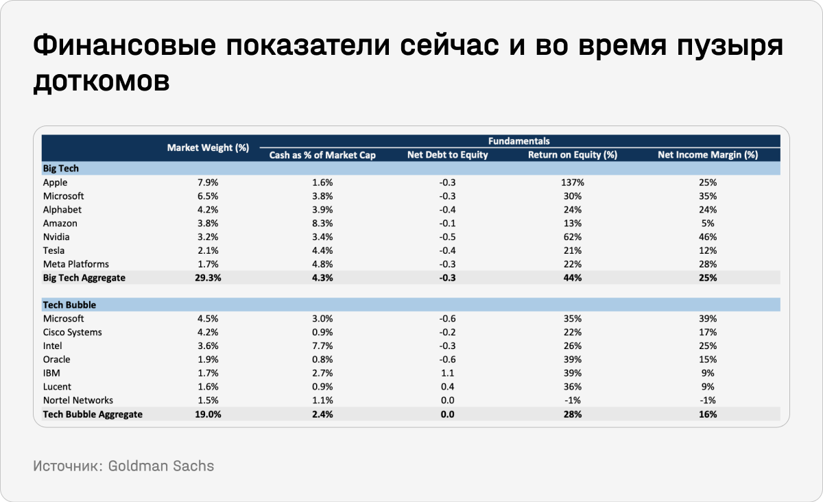 Например, сейчас у бигтехов на счетах находятся денежные средства в размере около 4% от их рыночной капитализации по сравнению с 2% на пике пузыря доткомов. И хотя отношение чистого долга к собственному капиталу сейчас такое же, рентабельность собственного капитала нынешних бигтехов составляет 44%, а средняя маржа — 25%, что почти вдвое превышает средний показатель лидеров 1990-х годов.