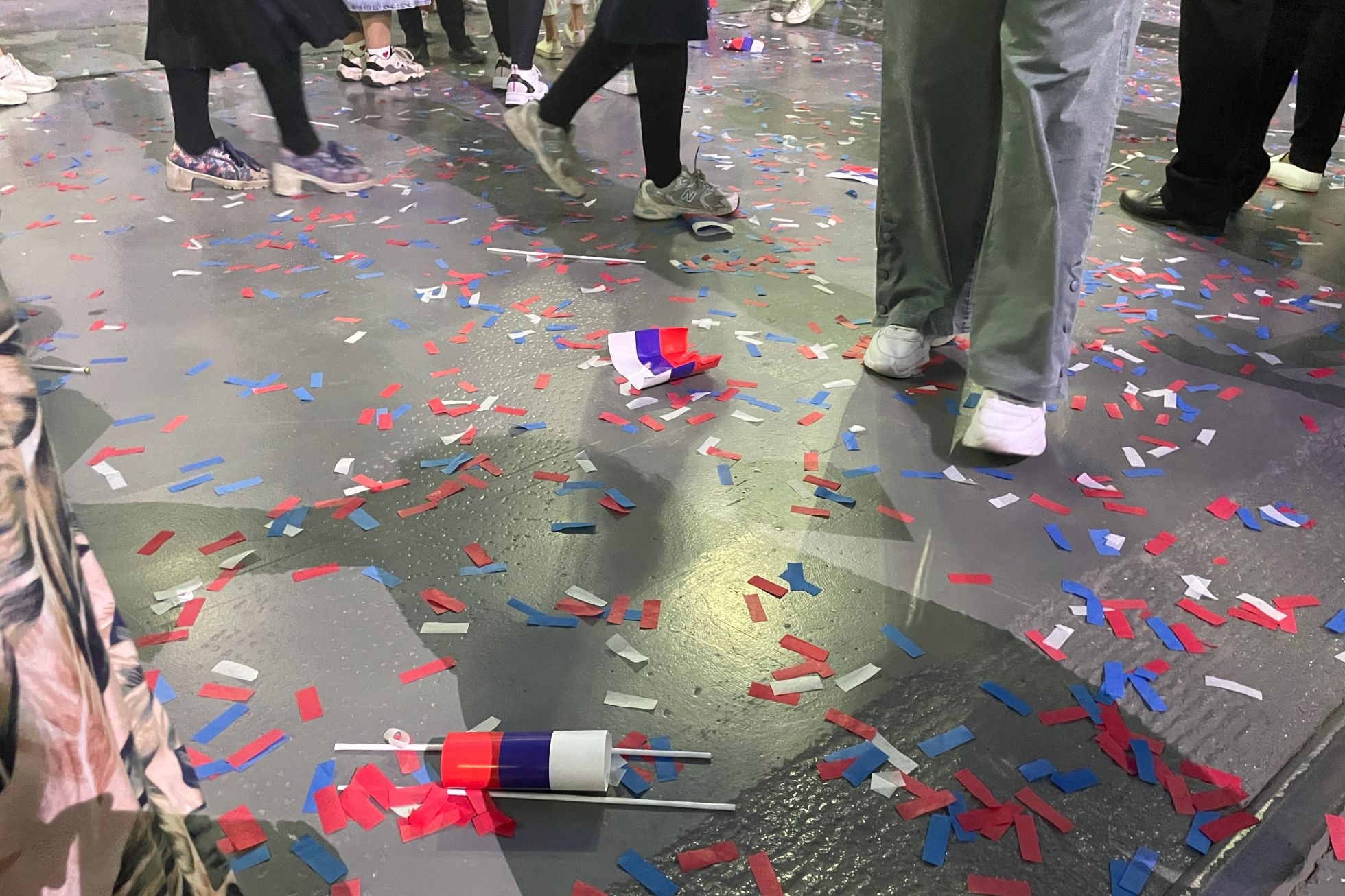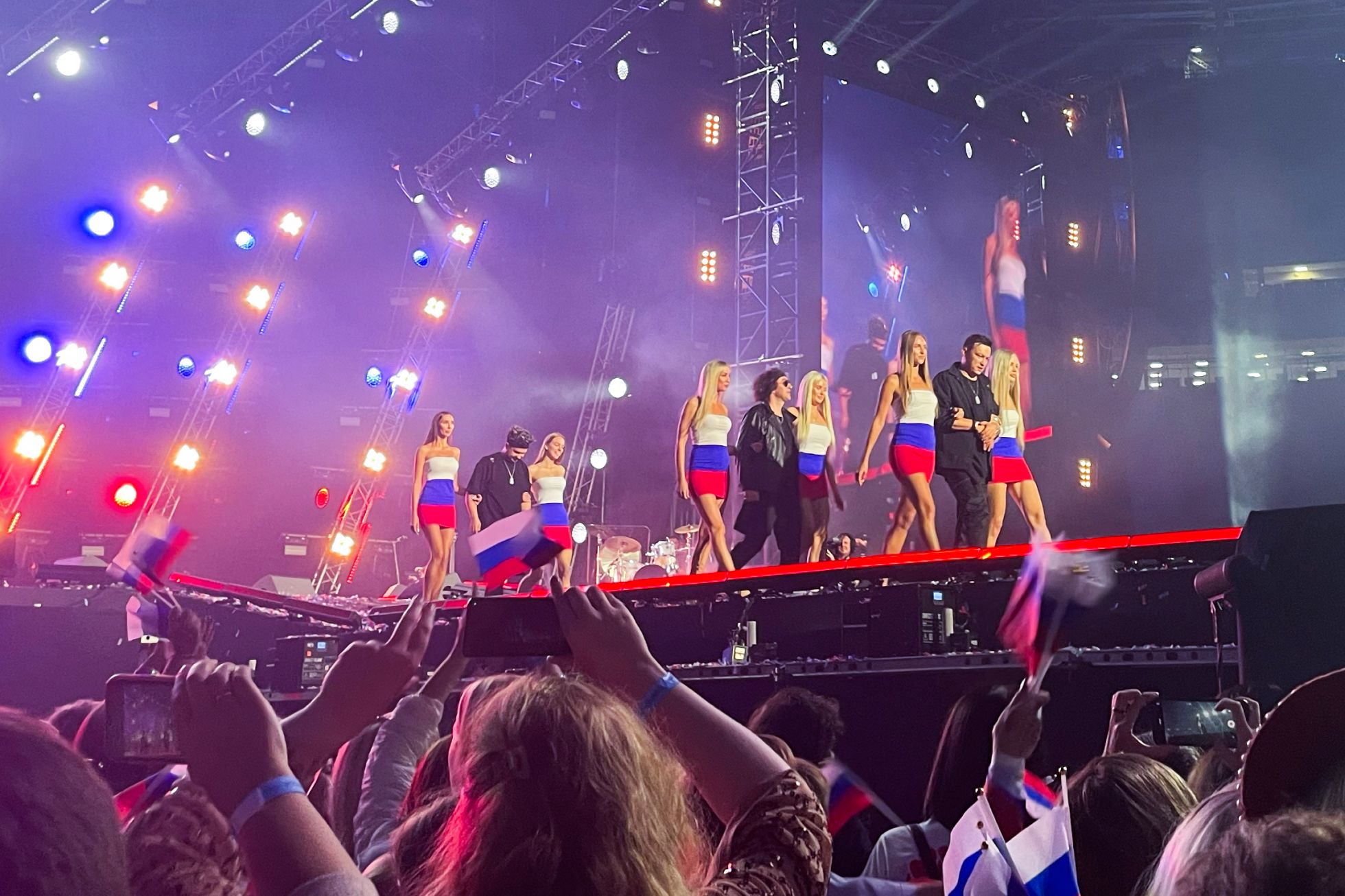На этих словах Полунин удаляется со сцены. Публика оживляется: почти вся фан-зона подпевает и танцует. На припеве в зал рассыпаются бело-сине-красные конфетти — зрители начинают ловить их.