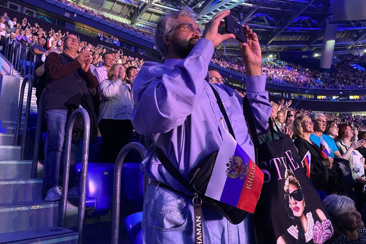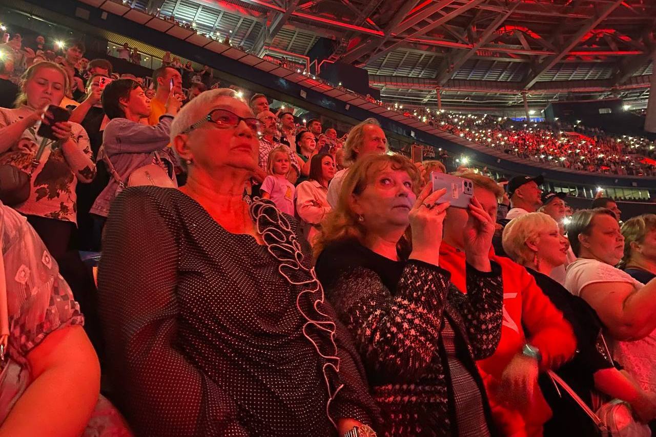 За час до концерта к «Газпром Арене» потянулись толпы зрителей. В очередях на входе встречались и мужчины с накинутыми на плечи российскими флагами, и молодые девушки в кокошниках и нарисованным триколором на скулах, и пожилые дамы с аккуратными укладками, и кадеты, и семьи с маленькими детьми.