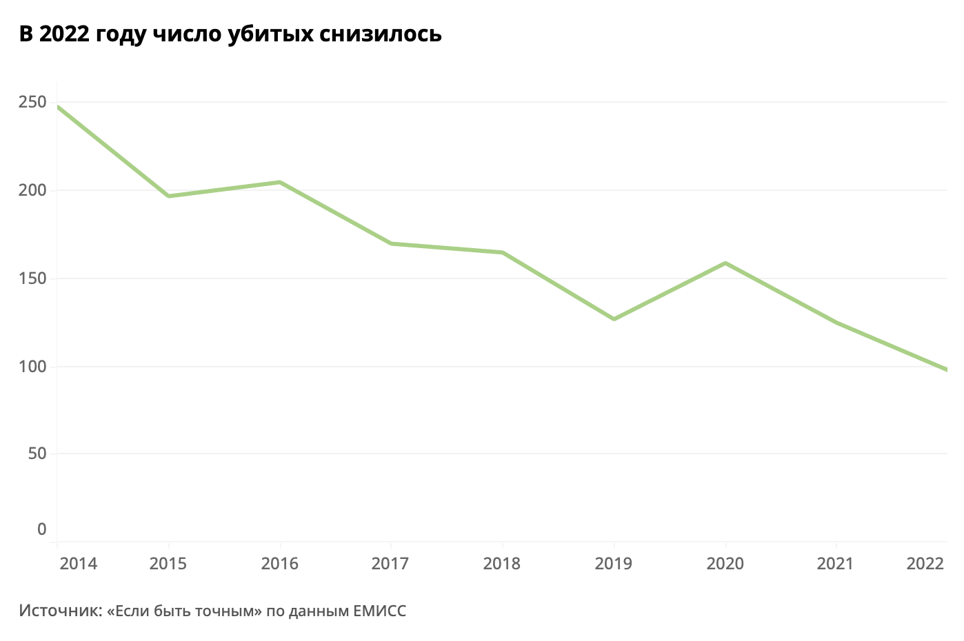 Позже проект «Если быть точным» собрал данные о преступности в России, учет которых ведет МВД, — их размещают на портале Единой межведомственной информационно-статистической системы и на сайте правовой статистики Генпрокуратуры. По ним, число убитых в Петербурге постепенно снижается с 2020 года. В 2021 году оно снизилось на 21,38 % до 125 человек, а в 2022 — на 21,6 % до 98 человек.
