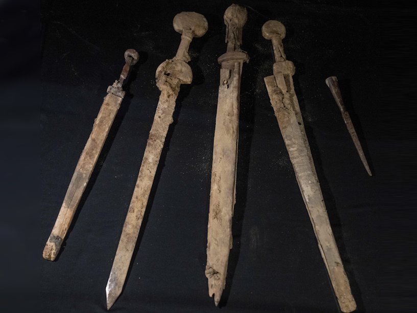 Археологи вызвали подкрепление из Управления древностей Израиля и в итоге обнаружили четыре меча. Три из них относятся к типу «спата», длиной около 60 сантиметров. Четвертым был меч с кольцевым навершием и коротким лезвием длиной около 45 сантиметров. Три из четырех мечей благодаря сухому климату пустыни сохранили деревянные ножны.