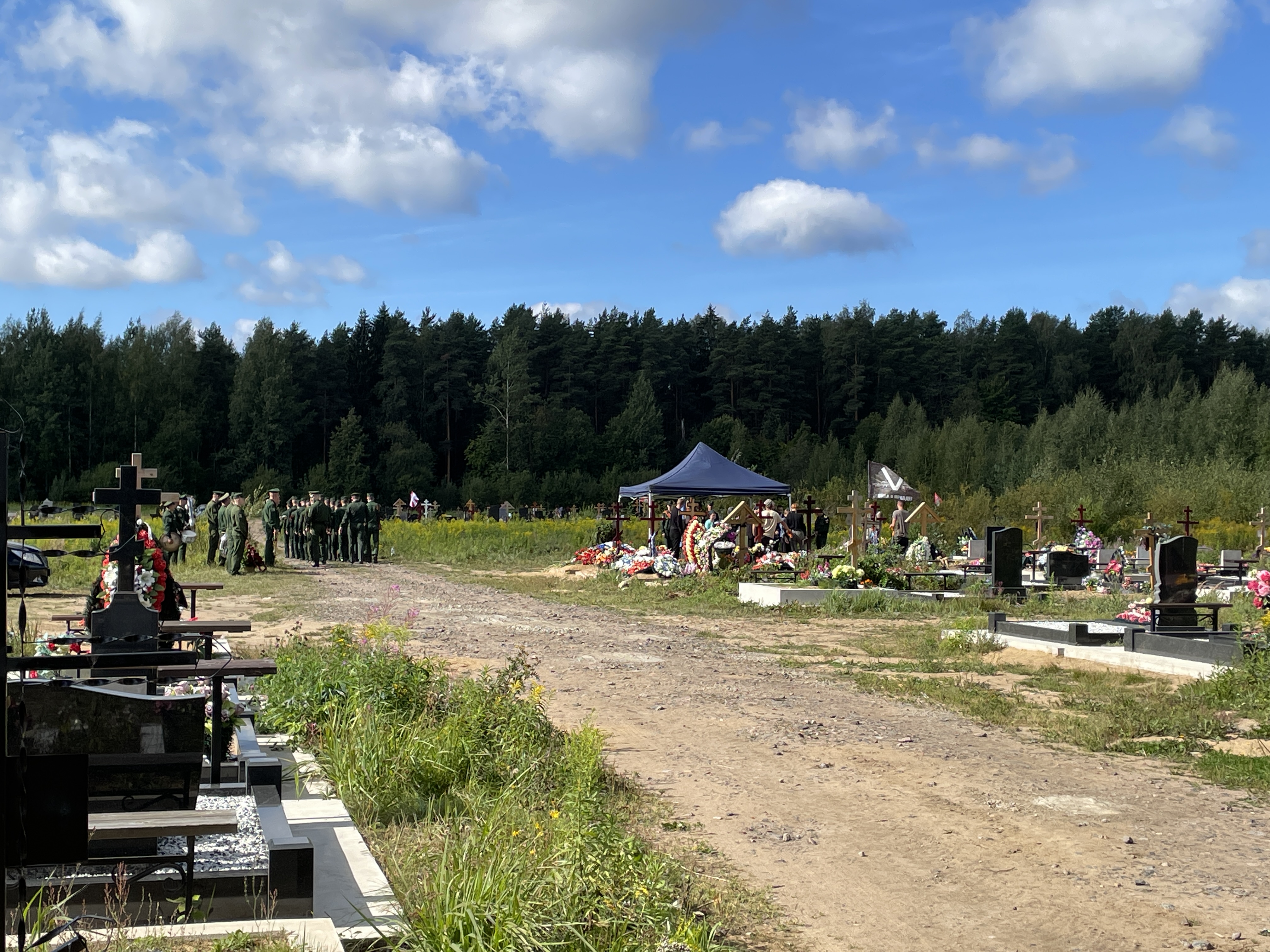 Прощание длилось недолго и обошлось без речей. Музыканты заиграли гимн России, гроб опустили в могилу. Группа военных сделала несколько залпов в воздух. Гробовщики закопали могилу, выстроили на ней ровную трапецию из песка, установили венки и цветы. После этого родственники погибшего довольно быстро ушли. Вслед за ними начал удаляться и военный оркестр, продолжая играть "Прощание славянки".