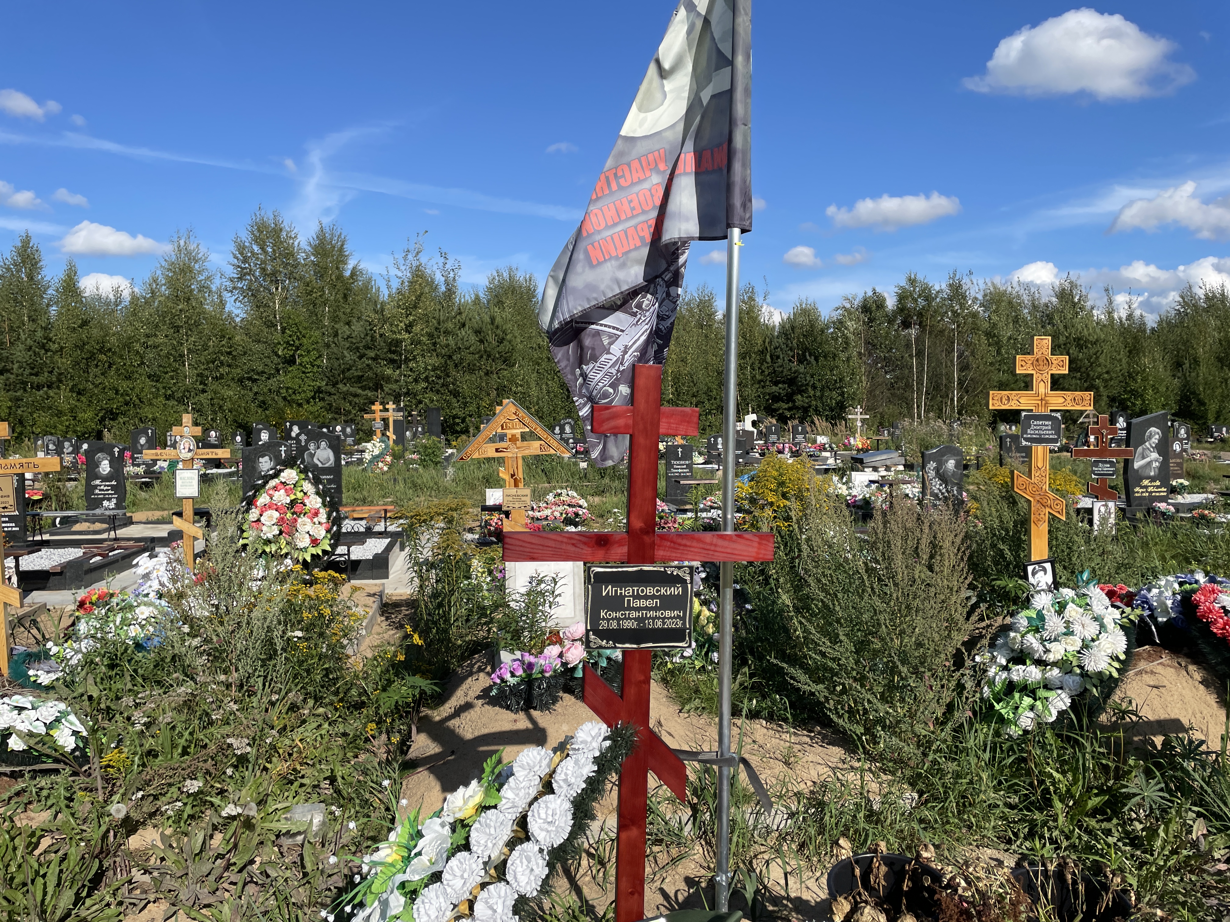 За могилой Волнянко видно захоронение еще одного участника вторжения в Украину, Павла Игнатовского. Там установлен серый флаг с красными буквами ZOV. Рядом похоронен еще один погибший на войне, вероятно, фанат петербургского ФК "Зенит" Сергей Губанов. Его могильный крест обвит сине-бело-голубым шарфом (цвета "Зенита". – СР), рядом флаг с надписью "Сила в правде". Никаких флагов или символики ЧВК "Вагнер" на могиле Волнянко нет, только несколько венков и фотография.
