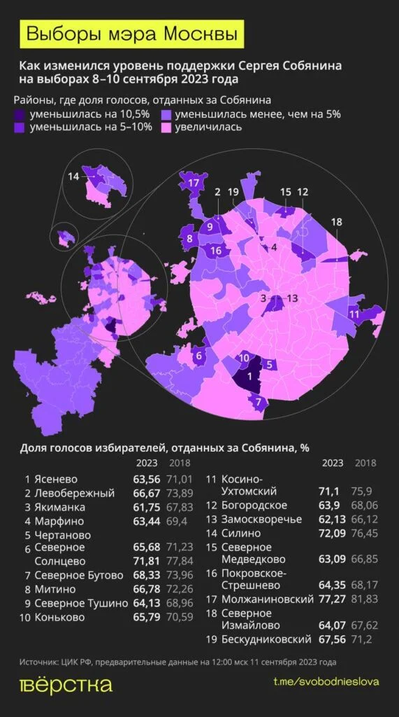 Более чем в трети районов Москвы Собянин ухудшил результаты по сравнению с предыдущими выборами мэра - Вёрстка