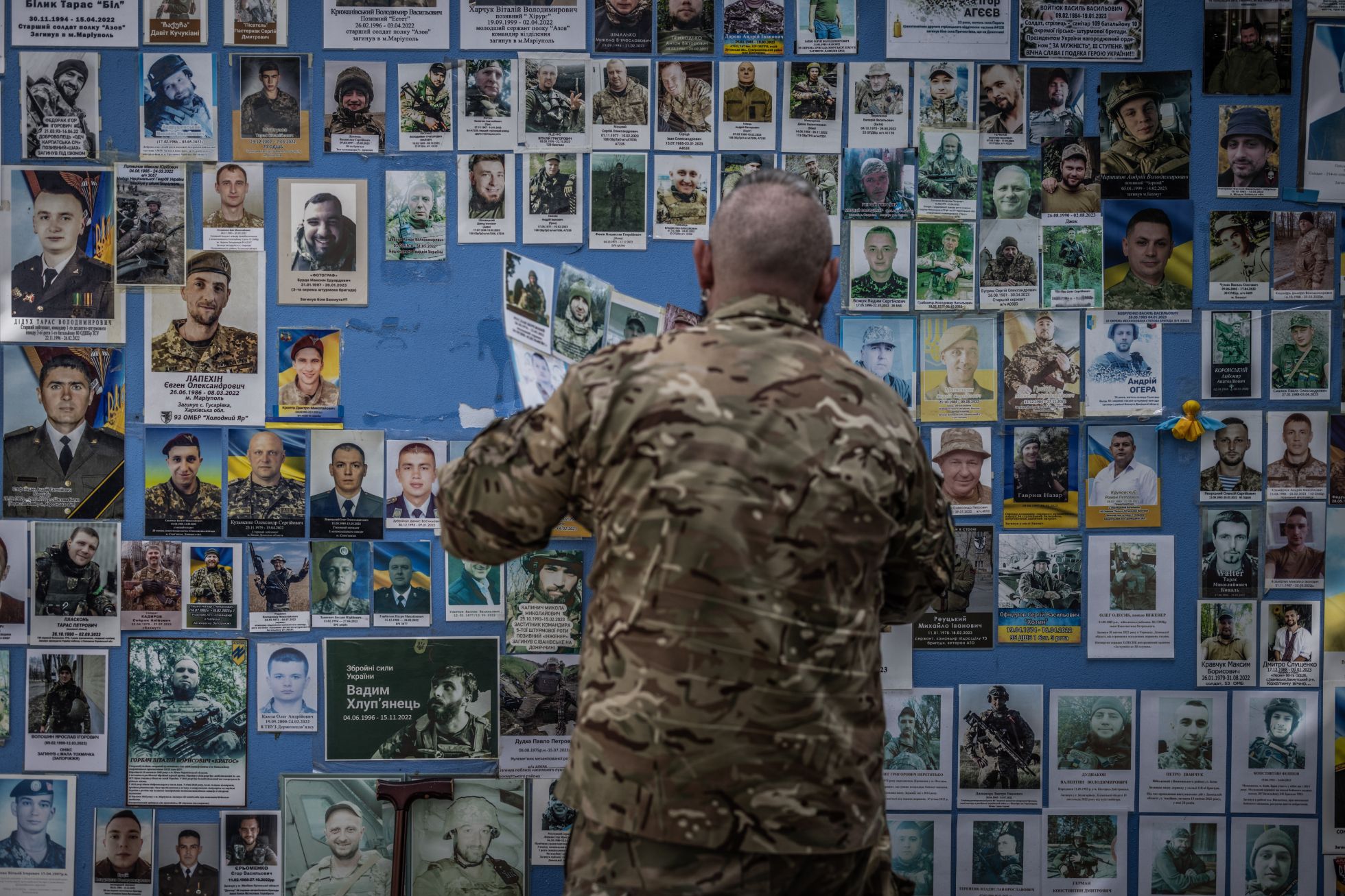 Военнослужащий вешает портрет сослуживца на Стену памяти в Киеве