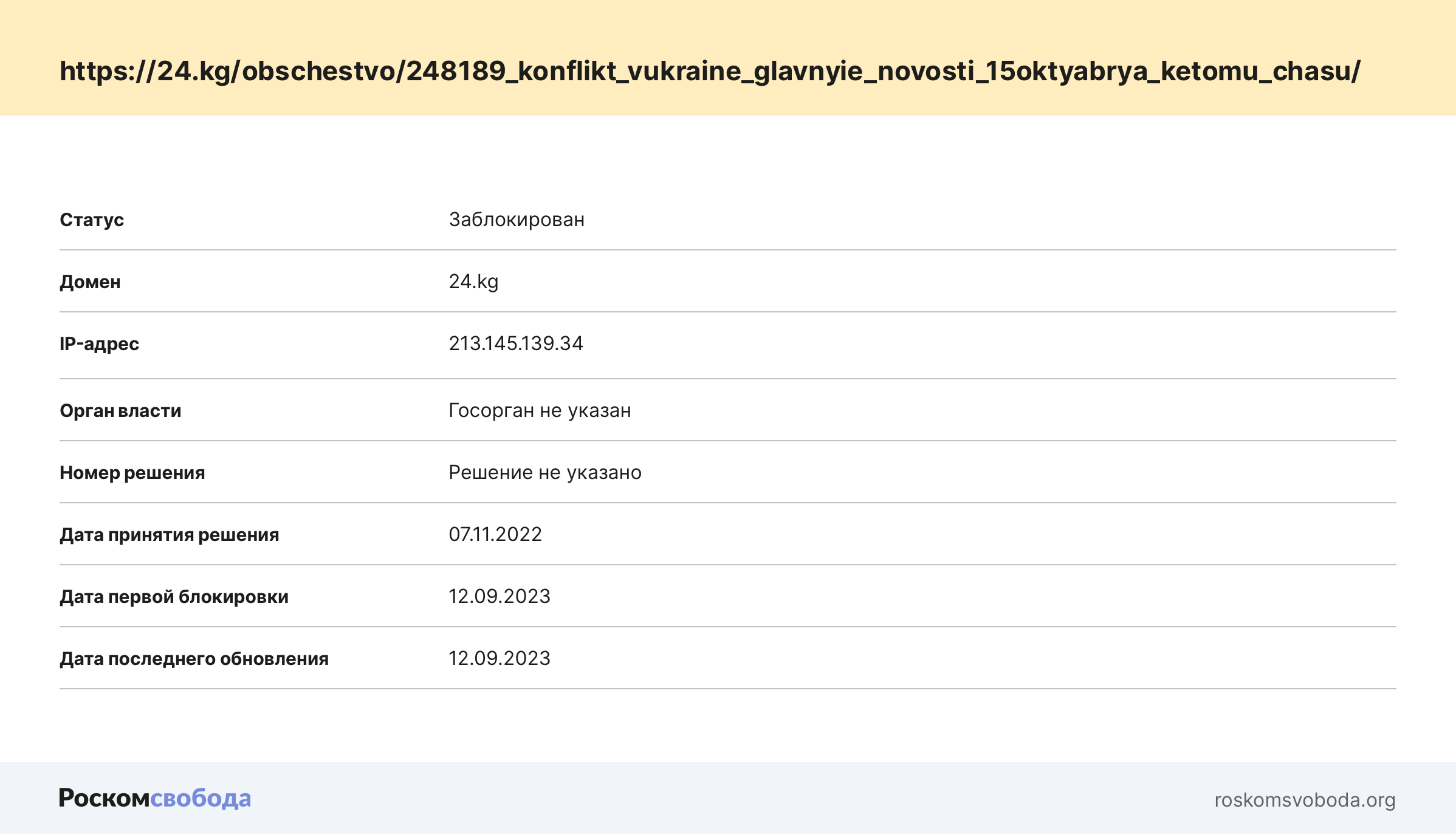 Под блокировку попала статья о действиях России на территории Украины. Кроме того, заблокированы сразу несколько статей о «спецоперации» и возможной новой волне мобилизации в двух центральноазиатских СМИ. Также по закону о «нежелательных организациях» запрещена ссылка с прошлогодним анонсом открытия «Пражским гражданским центром» исследовательской резиденции для журналистов в столице Чехии.