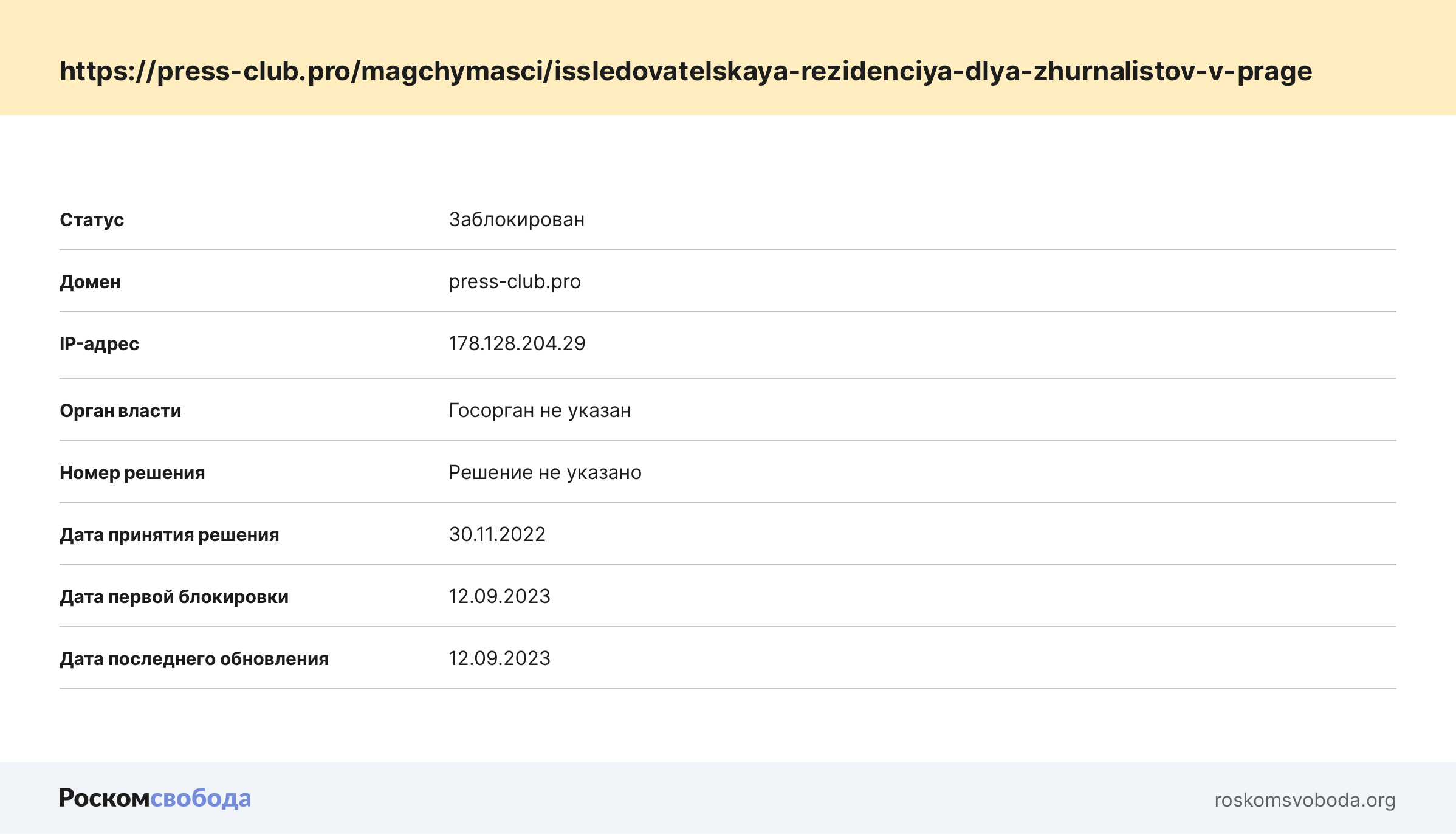 Только причиной стала не военная цензура, а создатель резиденции — «Пражский гражданский центр», который в декабре 2020 года был объявлен «нежелательной в России организацией», а значит все его сайты и связанный с ним материалы подлежат блокировке. Полномочия по внесудебному ограничению доступа к такой информации имеет Генпрокуратура, которая, по нашему мнению, с большой долей вероятности и скрывается под тем самым «Неуказанным госорганом».