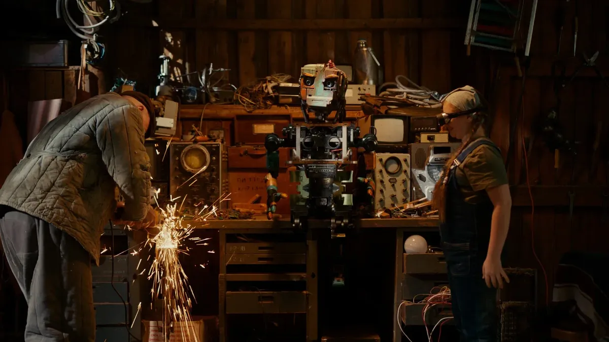 В «Кибердеревне» Сергея Васильева (Кинопоиск) — громкокипящая смесь: робот Ваня (озвучивает Сергей Бурунов), получение визы на спутник-Европа, кибер-березы, лифт на небо, подписка на холодильник и летающий телевизор, перекачка сознания, жена-мечта: голограмма, которую можно поставить на паузу, Валл-И, Любовь и голуби на Марсе. И родной Левиафан — разрушенный город Усть-Марсианск. Ржавая эстетика свалки (привет «Кин-дза-дза!»). Объятия на сене под космическими антеннами. И протяжная: «Ой вы нейросети».