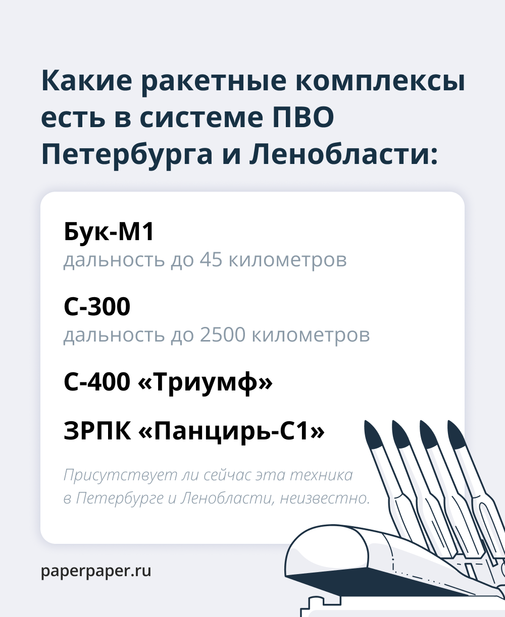 Где именно и в каком количестве находится техника ПВО в Петербурге и Ленобласти, неизвестно, так как эта информация засекречена. «ПВО региона — это не нечто постоянное, потому что технику могут перевозить, особенно во время военных действий», — объясняет Давид Шарп.
