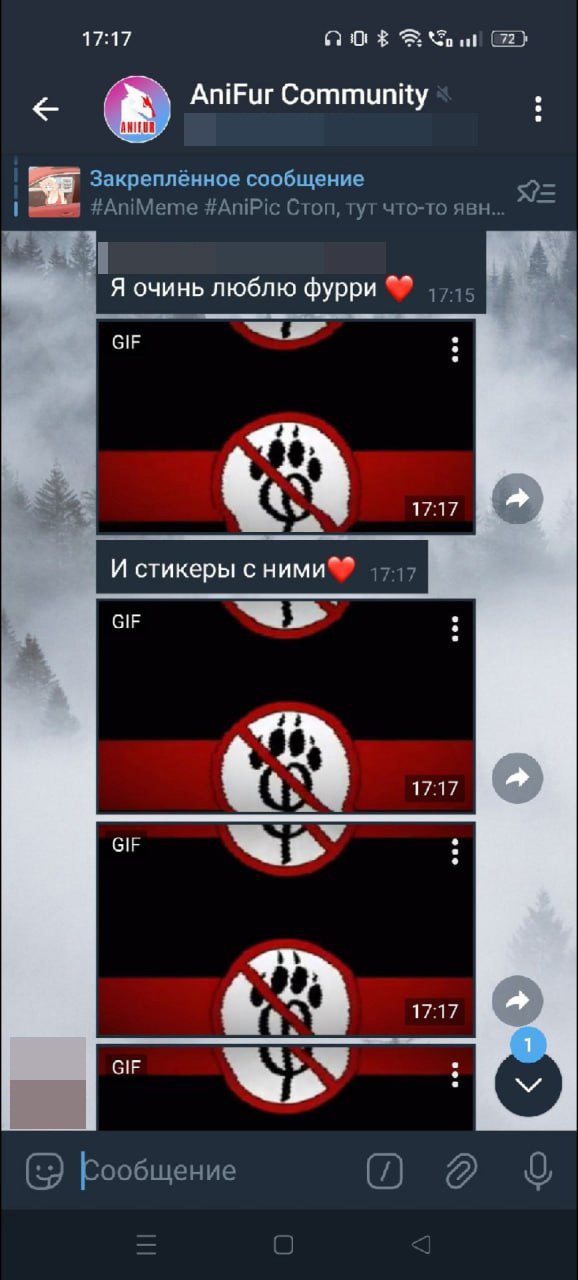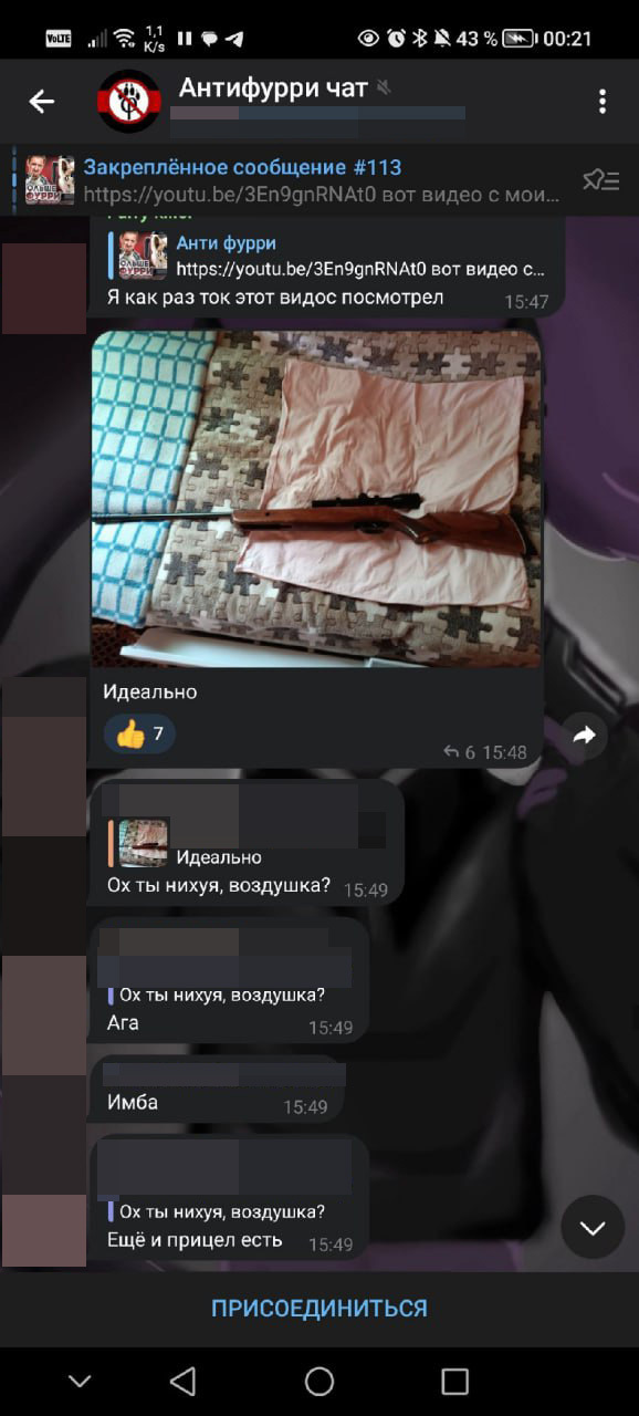 Антон утверждает, что некоторые антифурри отправляют фотографии оружия, из которого они угрожают расстреливать фурри. При этом в одной из переписок, скриншот которой есть у «Бумаги», представитель антифурри сообщает, что переходит в 6 класс.