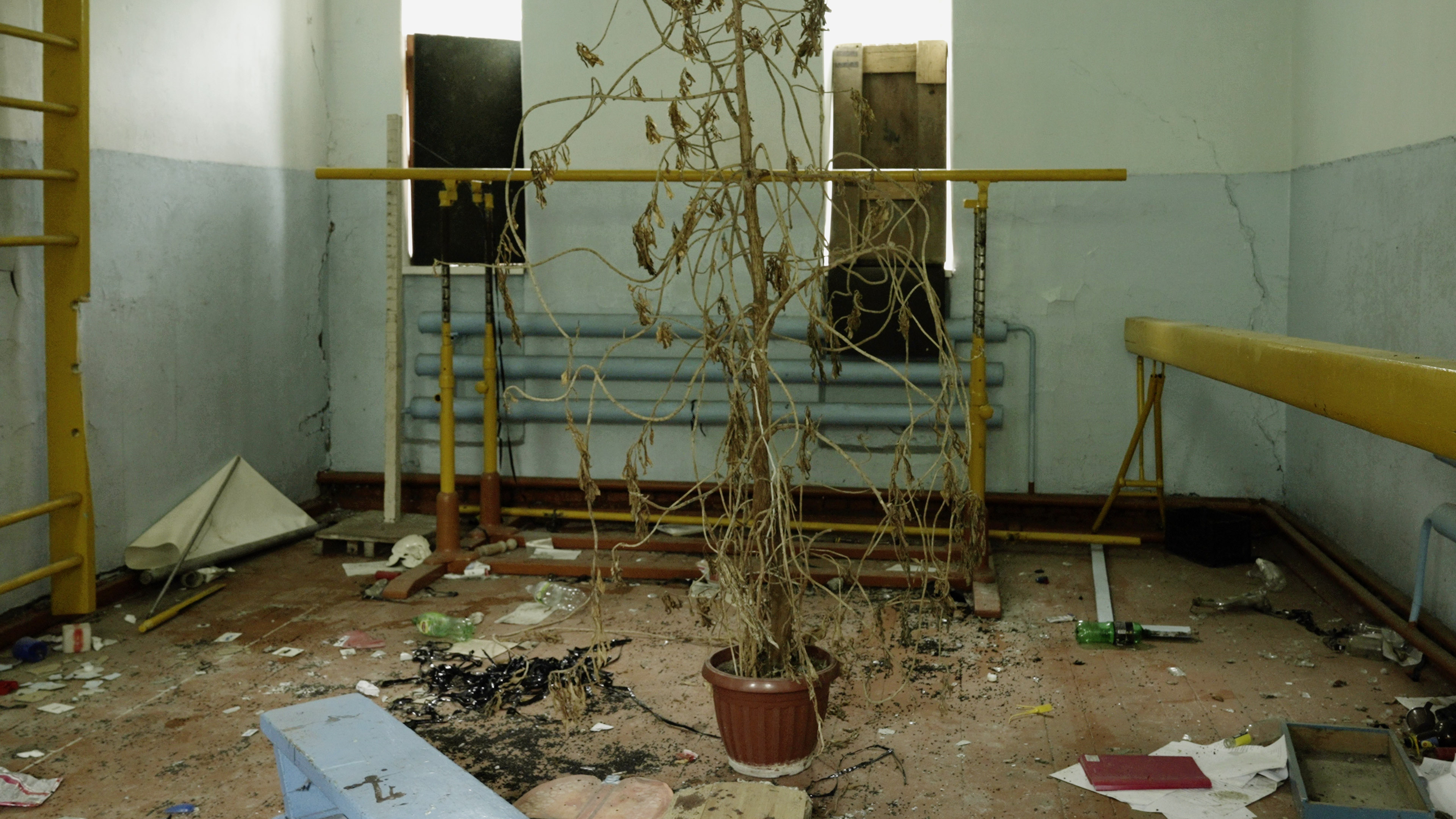Внутри школы – дыры в полу, горы книг в углах кабинетов, пластиковые пивные бутылки. По словам парня, молодежь собирается здесь бухать и курить анашу. Посреди спортзала стоит кадка с мертвым деревцем – истончившимся, но почему-то не упавшим. Под потолком мечутся птицы. У входа плакат: "Терроризм – угроза обществу".