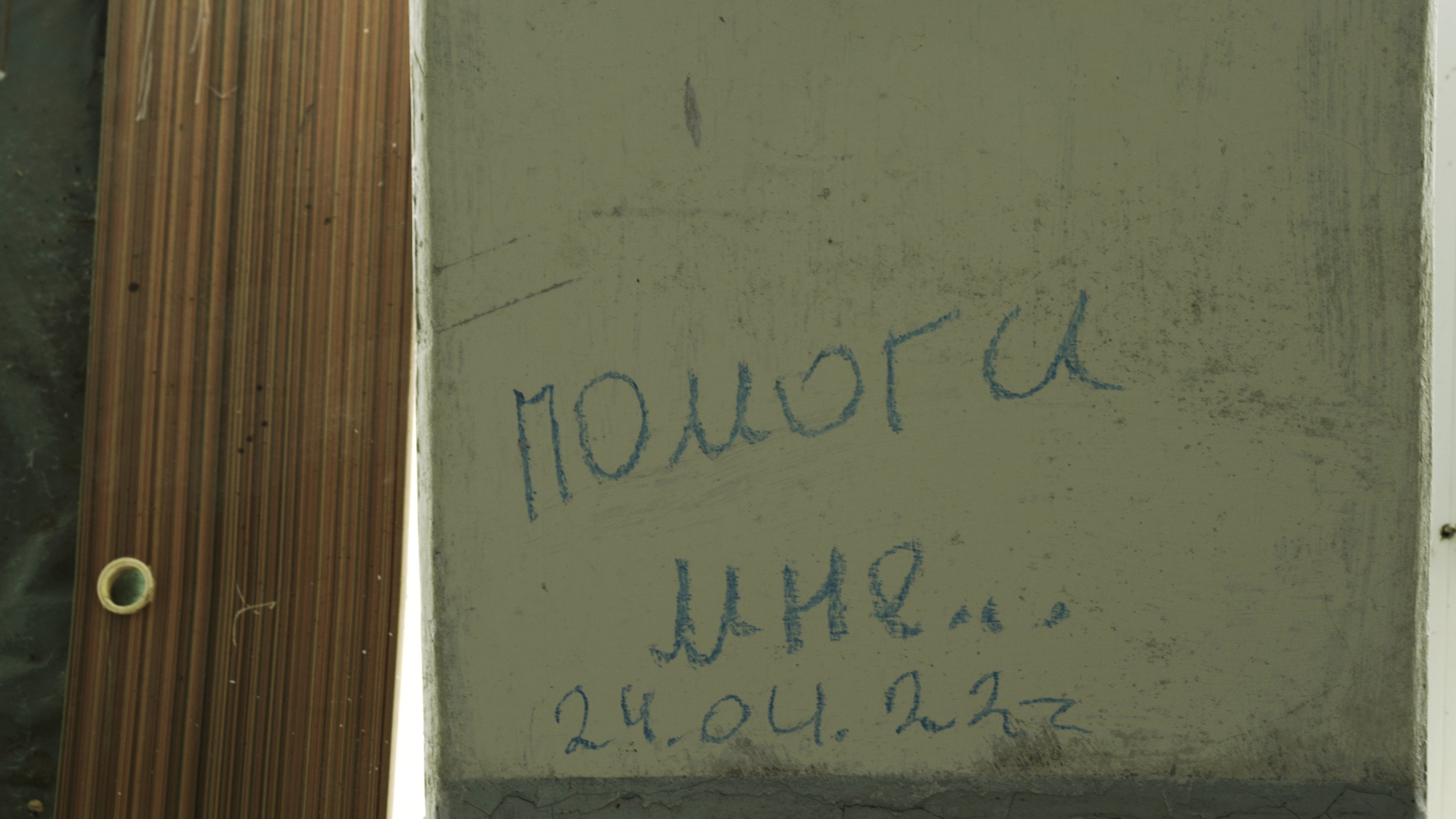 На стене школьного холла надпись синим: "Помоги мне". И дата – 24.04.2022.