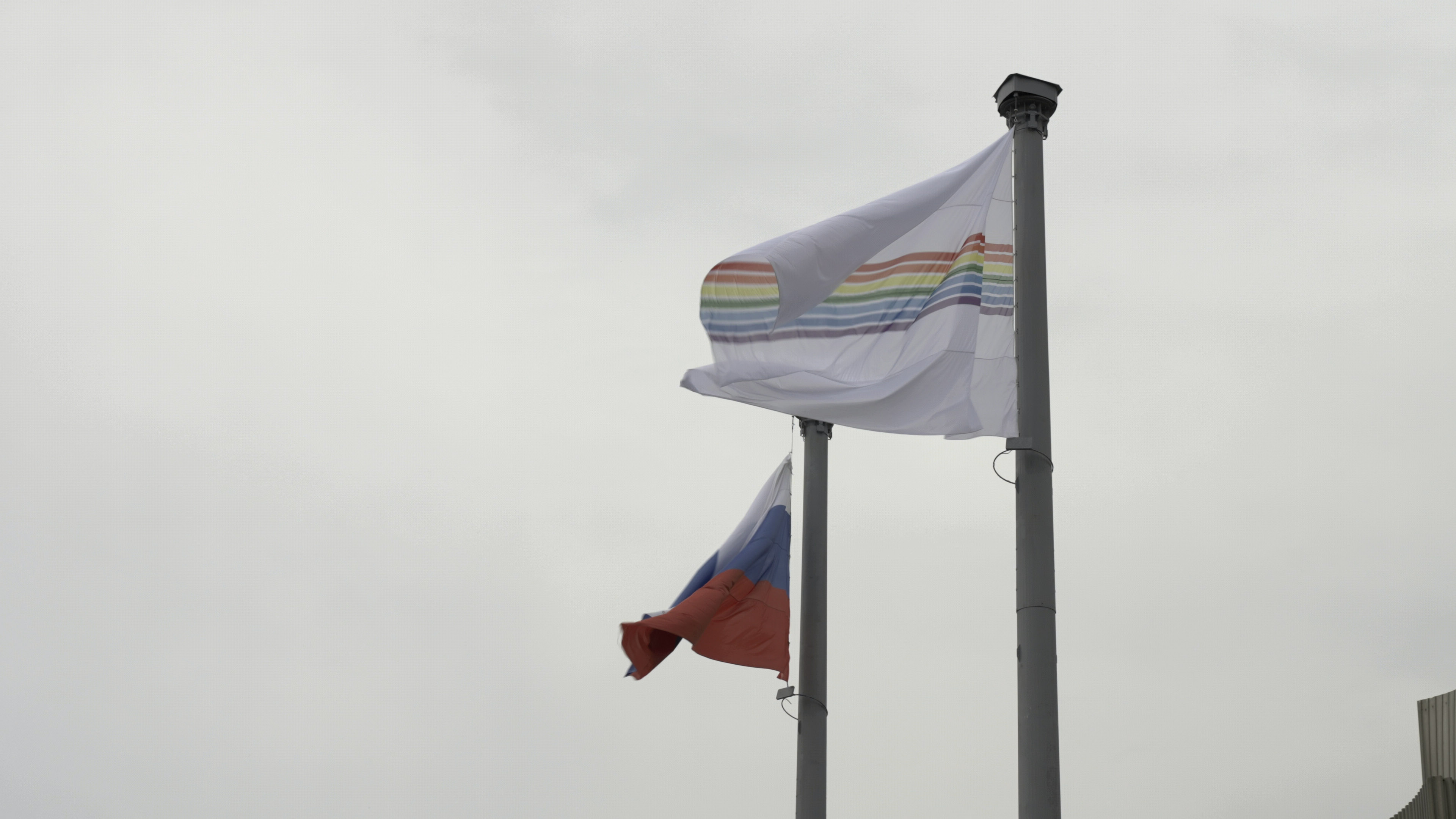 Рядом с российским триколором тяжело развевается флаг области – радуга на белом фоне. Губернатор Ростислав Гольдштейн подчёркивает, что это не намёк на ЛГБТ, а библейский символ Господа.