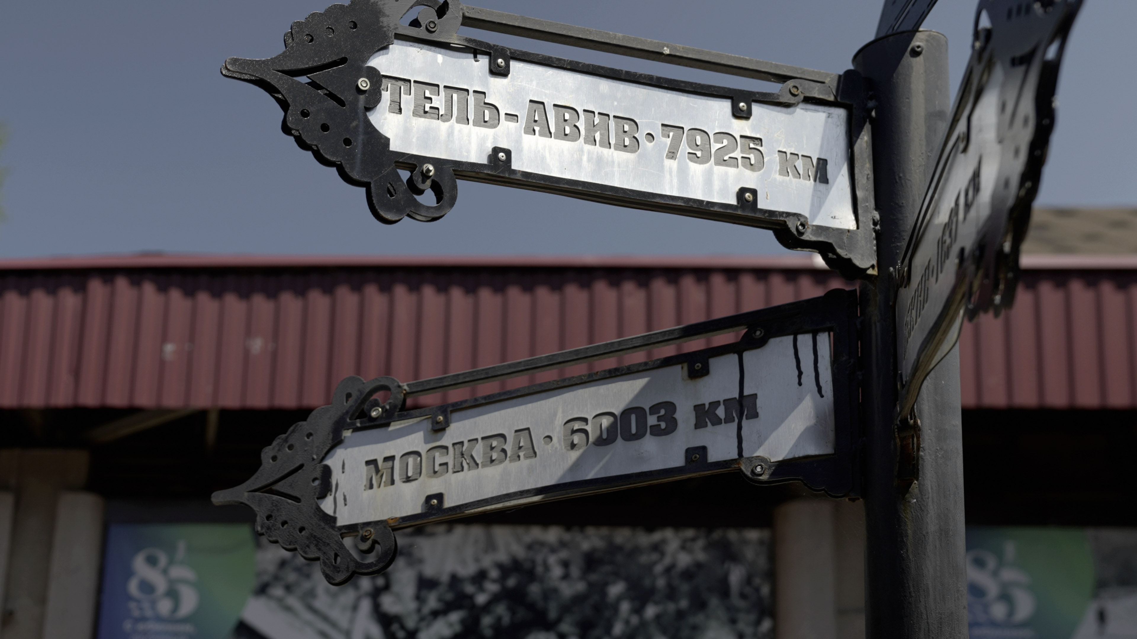 Если верить указателю в центре Биробиджана, до Тель-Авива отсюда 7925 километров. До Москвы немногим ближе – 6003 километра. В столь отдаленном месте, кажется, ничего не менялось лет двадцать. Аккордеонист играет блатняк образца 90-х, пьяные танцуют посреди пешеходной зоны. Всюду реклама гастролей цирка, скупки волос и помощи наркозависимым. С названиями улиц, дублирующимся на идише, – Советская, Комсомольская – соседствует редкая примета нового времени: плакаты с буквой Z.