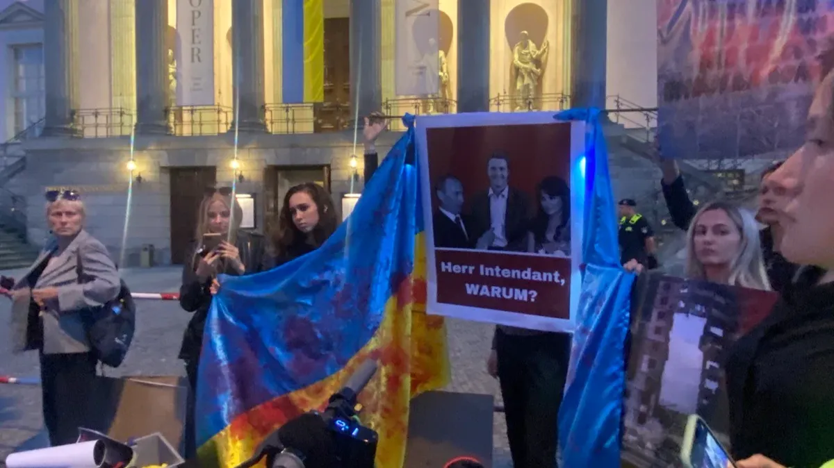 Протесты рядом с Берлинской оперой начались около 18:30, за час до начала выступления. Здание оперы было украшено в этот вечер двумя украинскими флагами. Демонстранты обвиняли руководство оперы в распространении soft-пропаганды, громко скандировали «Россия — террористическое государство» и «Позор!» на русском и немецком языках.