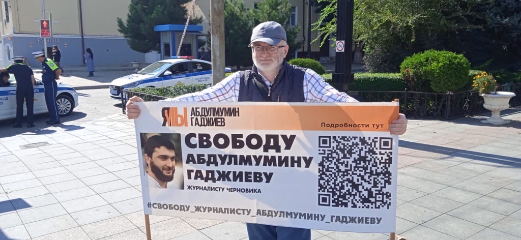 В Махачкале прошел очередной одиночный пикет с требованием освободить журналиста газеты "Черновик" Абдулмумина Гаджиева. На прошлой неделе его приговорили к 17 годам лишения свободы колонии строгого режима по обвинению в финансирования терроризма.