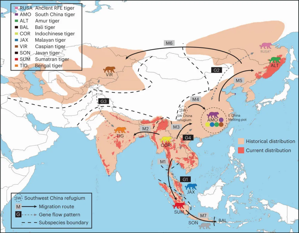 Исследование палео-ДНК показало, что юго-западный Китай был убежищем для реликтовых линий тигра, а восточный Китай — древним генетическим «плавильным котлом», где перемешались различные линии, которые расширили ареал обитания после возвращения подходящих условий.