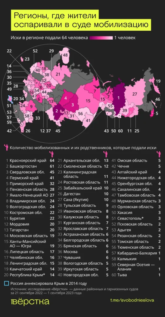 Активнее всех мобилизацию пытались обжаловать мужчины из Красноярского края (64), республики Башкортостан (61), Свердловской области (44), Пермского края (41) и Приморского края (32). При этом каждый третий мобилизованный из Красноярского края, решившийся пойти в суд, выиграл дело.