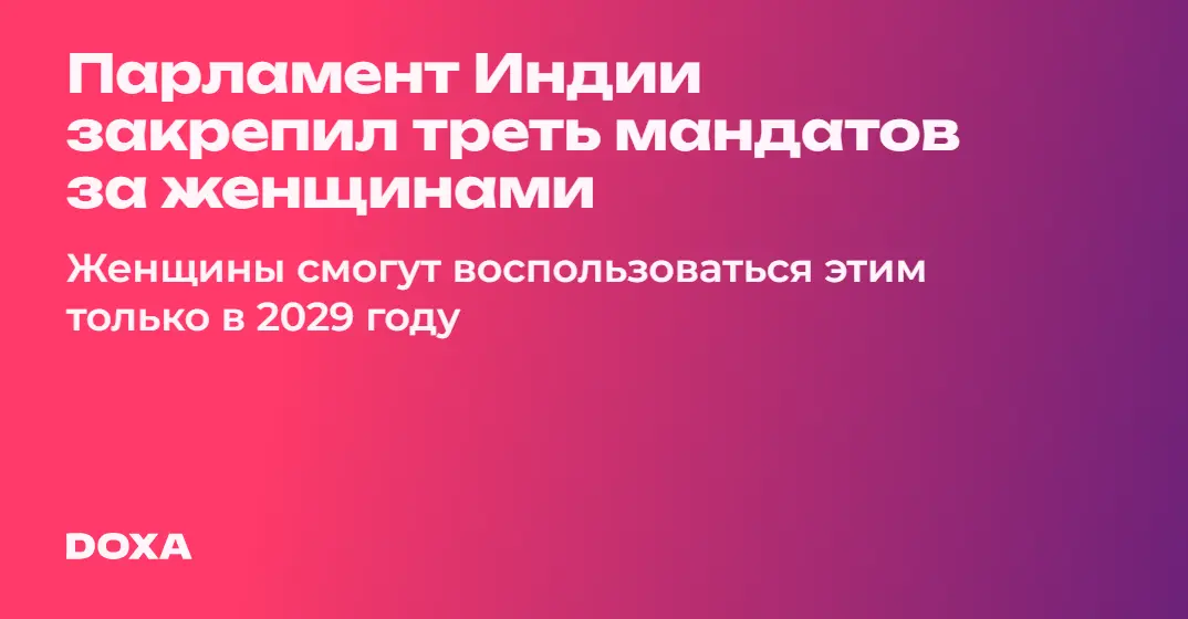 20 сентября индийский парламент проголосовал за закрепление 33% депутатских мандатов за женщинами в нижней палате парламента страны. В поддержку законопроекта проголосовали все депутат_ки, кроме двух. Сейчас индийские женщины представляют лишь 15% парламента.
