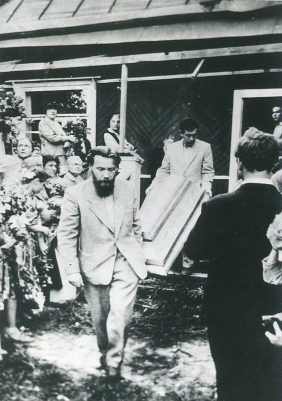 Писатели Андрей Синявский и Юлий Даниэль выносят крышку гроба на похоронах Бориса Пастернака. Переделкино, 2 июня 1960 г. Через несколько лет Синявского и Даниэля отправят в лагерь за передачу для напечатания за границей произведений, «порочащих советский государственный и общественный строй», и эту фотографию станут называть «Синявский и Даниэль несут свою скамью подсудимых».