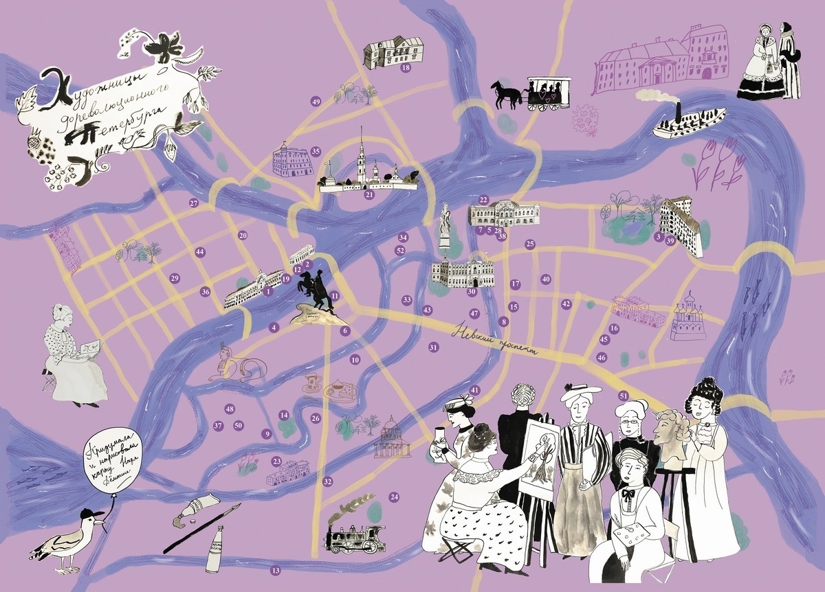 Журналистка и художница Надежда Демкина решила восполнить пробел. Она составила иллюстрированную карту с 52 адресами «Художниц дореволюционного Петербурга». «Бумага» рассказывает, как Надежда исследует и сохраняет имена женщин в искусстве.