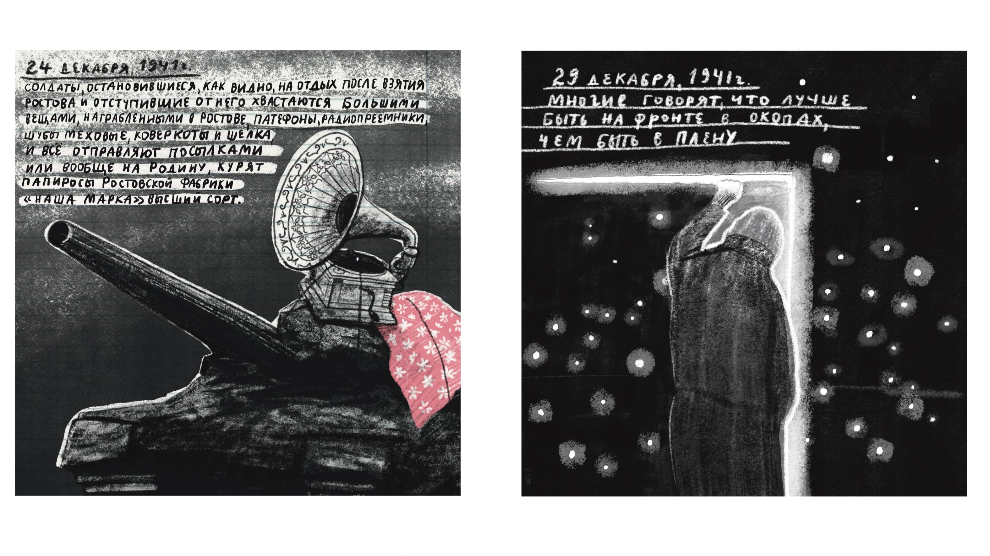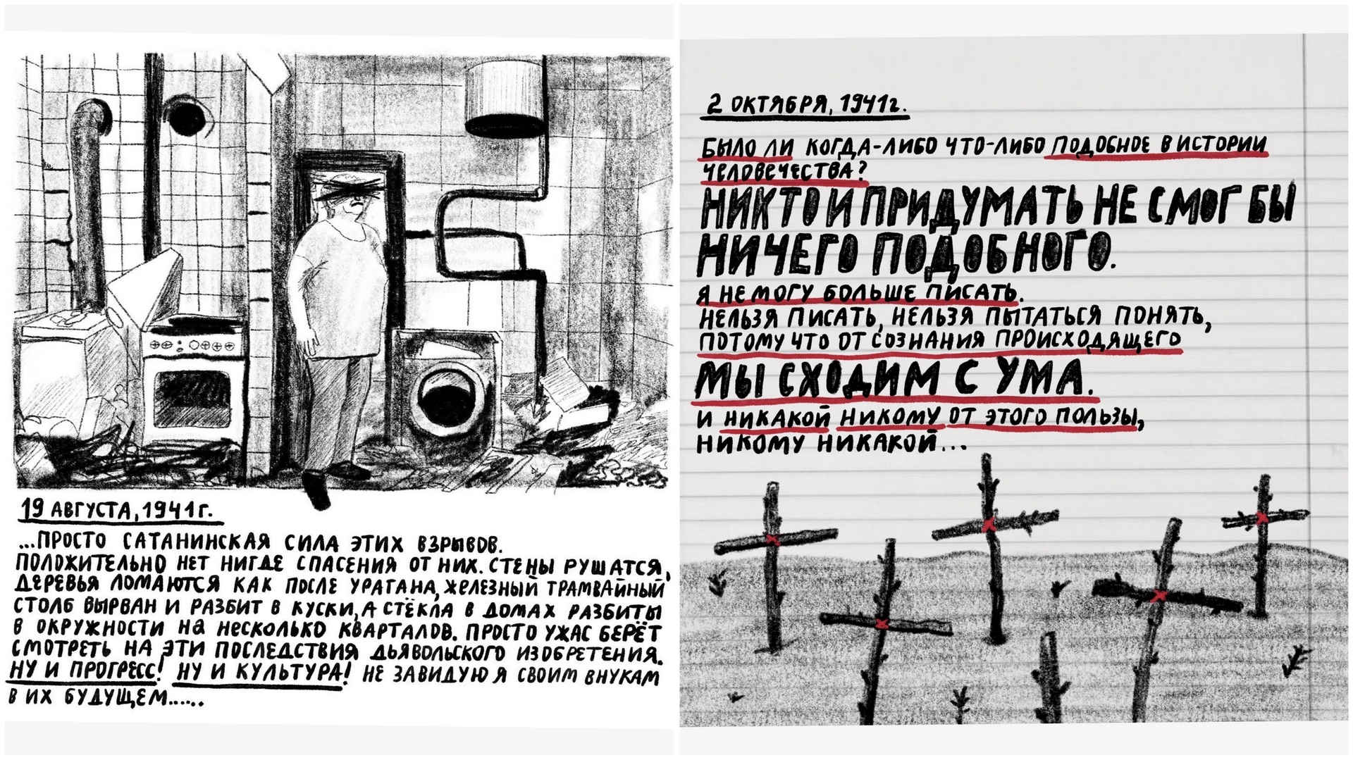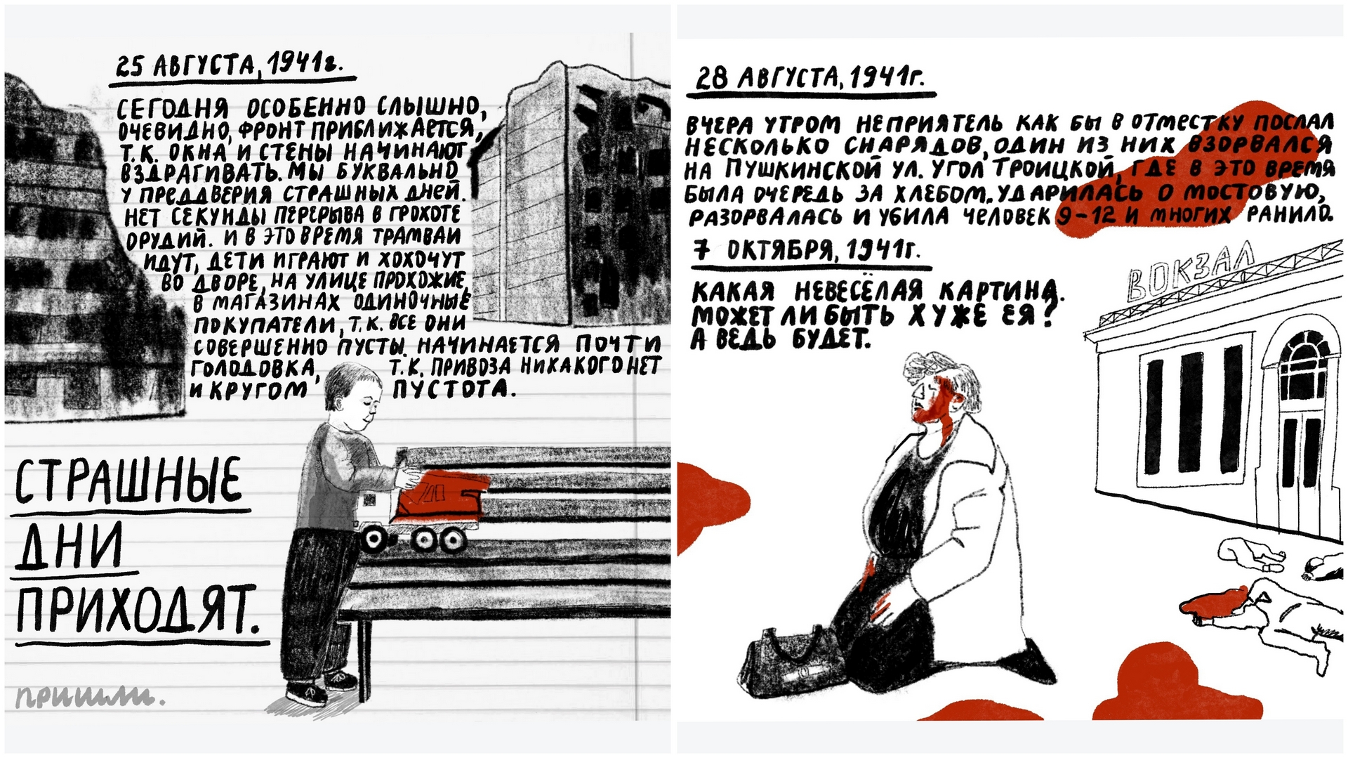 С 24 февраля прошло уже пару месяцев, было больно, страшно, но всем нам хотелось что-то сделать. И тогда мой коллега Андрей придумал проект "Дневники войны". Изначально идея была в том, чтобы брать украинские дневники времен Второй мировой, а рядом записи тех, кто публикует сейчас онлайн-дневники из Украины, чтобы ни у кого не осталось сомнений, какое государство сейчас нацистское. Но потом мы посмотрели и поняли, что даже просто отрывки из дневников очевидцев ВОВ говорят сами за себя. Ну а я включилась в процесс как художник.