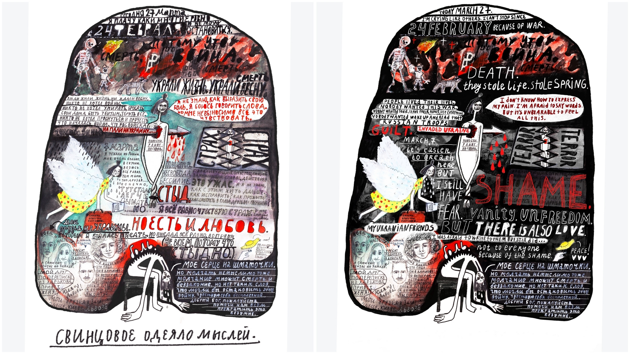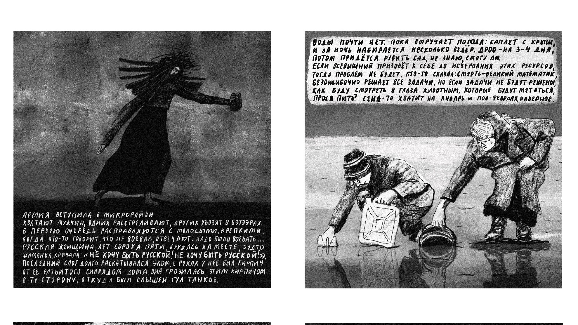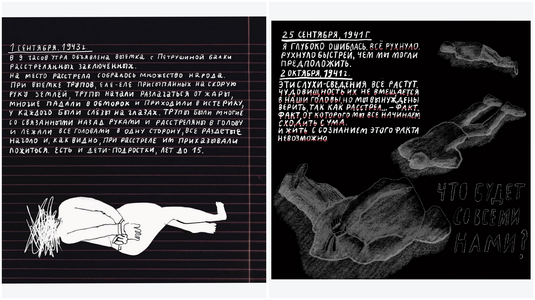 С 24 февраля прошло уже пару месяцев, было больно, страшно, но всем нам хотелось что-то сделать. И тогда мой коллега Андрей придумал проект "Дневники войны". Изначально идея была в том, чтобы брать украинские дневники времен Второй мировой, а рядом записи тех, кто публикует сейчас онлайн-дневники из Украины, чтобы ни у кого не осталось сомнений, какое государство сейчас нацистское. Но потом мы посмотрели и поняли, что даже просто отрывки из дневников очевидцев ВОВ говорят сами за себя. Ну а я включилась в процесс как художник.