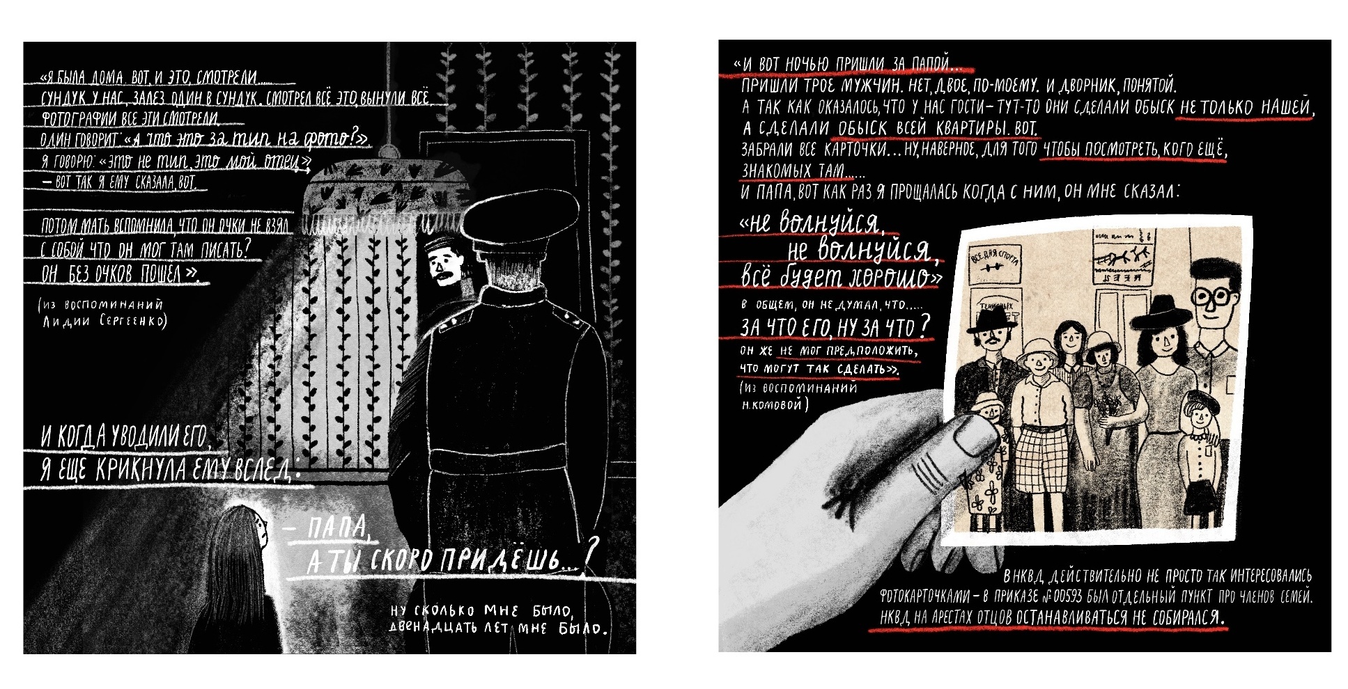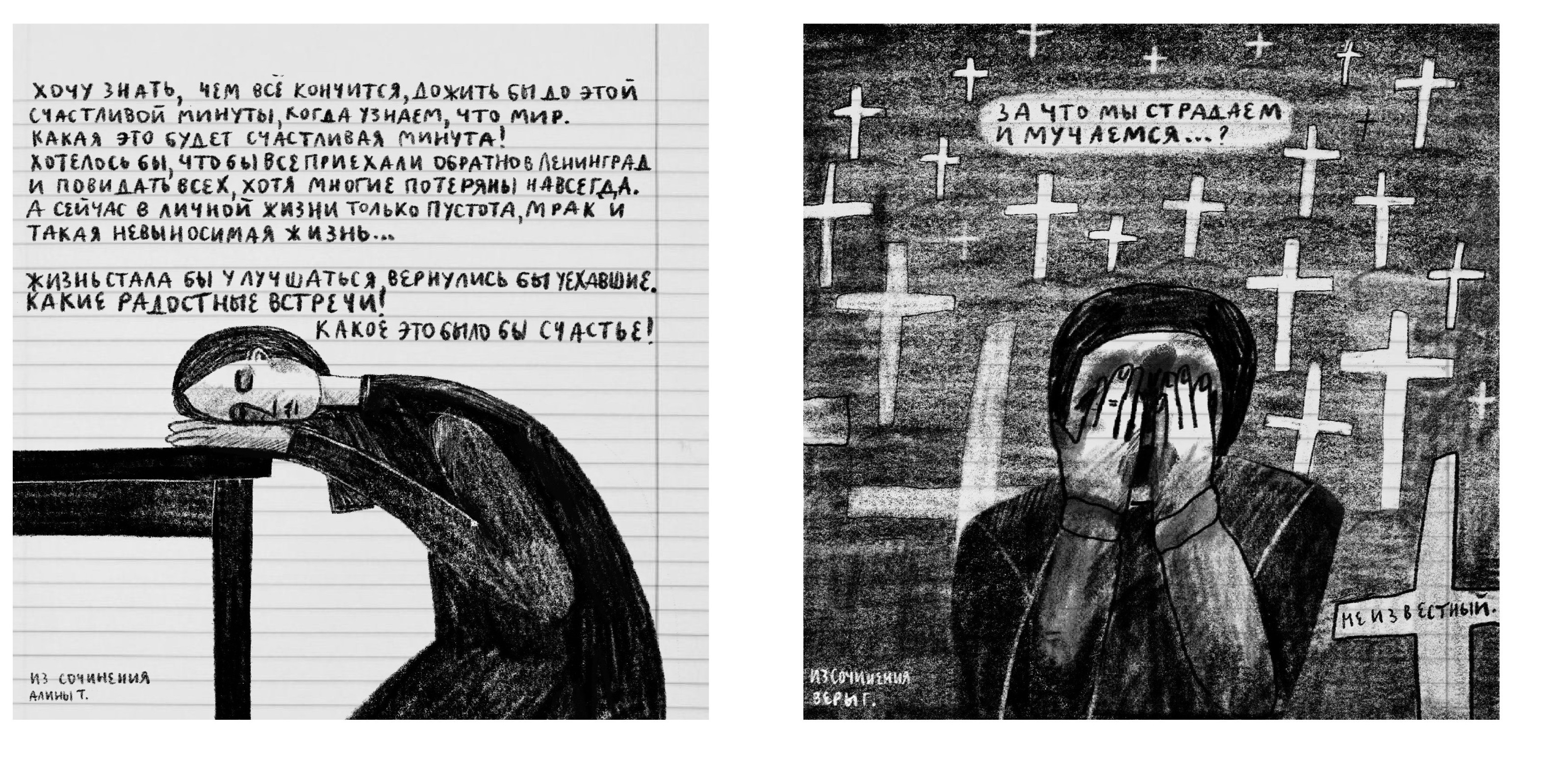 "Мемориал" многие годы проводил конкурс для школьников, вдохновляя их изучить историю своей семьи, в частности, истории репрессированных родственников: найти документы, порасспрашивать, поузнавать. Потом дети писали сочинения и отправляли на конкурс. Победители приезжали в Москву на награждение, целое событие было! Но "Мемориал" преследовали, потом ликвидировали, и участие стало небезопасным для школьников. "Школьный конкурс" закрыли. Он, конечно, возродился, но уже в другой форме. В общем, я делала иллюстрации на основе присланных сочинений.