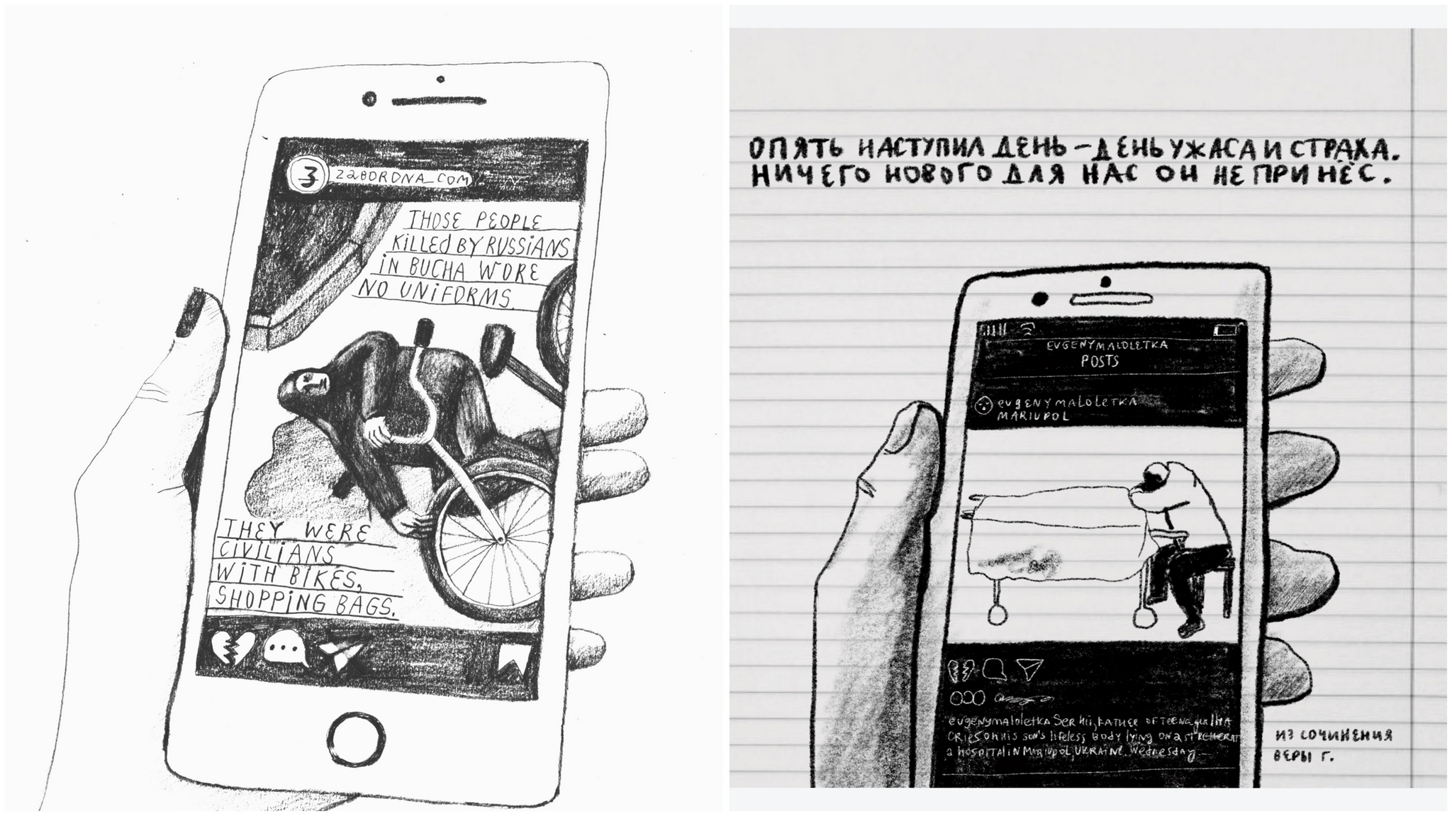 В мои рисунки включены известные фотографии. Наверное, вы знаете, что мой друг и учитель Виктор Меламед каждый день рисует убитых украинцев и украинок, рассказывая их истории и напоминая нам всем, что война всё ещё идет. Когда я работаю с реальными свидетельствами (фотографии, тексты, новости), то это одновременно и больно, и терапевтично: я в первую очередь документирую, конечно, но также в каком-то смысле помогаю себе хоть как-то преодолеть внутреннюю боль. Пока рисую, лью много слёз. Кроме того, фотографию преступления можно легко пролистнуть, а на рисунке взгляд всё-таки задержится. И ещё: его не скроют соцсети. Художник может что-то добавить или убрать, смягчить или заострить. Получается переосмысленная художественным образом многослойная конструкция.