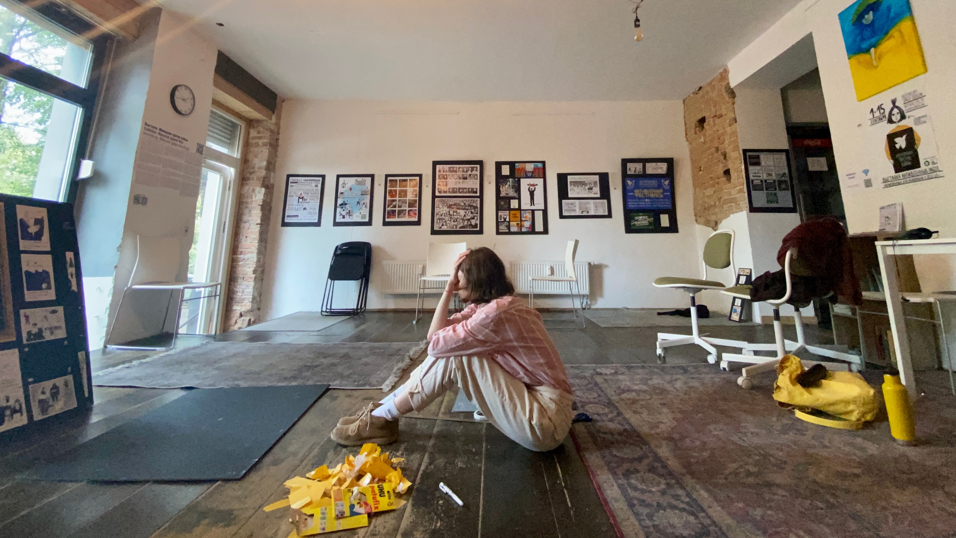 Художница на этом рисунке – это я. Дело в том, что у меня здесь, в Германии, есть проект совместно с музеем тюрьмы Андреасштрассе в Эрфурте. Мы делаем книгу про репрессии в ГДР в 1980-е годы. Я рисую историю одной политзаключённой, которую посадили за связь с иностранцем и попытку уехать на Запад. И в сюжете есть второй слой. Эта книжка и про того, кто рисует, книжка про меня, про эмиграцию, про войну и всё с этим связанное. Вообще-то бывает так, что рисовать сложно, рисовать даже и не хочется, честно говоря, но рисование как воздух и помогает проживать сложное. Периодически, конечно, захлёстывает волна того, что всё бесполезно, потому что ад продолжается. И тут как раз показан момент бессилия. Художница всё время преодолевает себя, потому что рисовать надо, а реальность придавливает.
