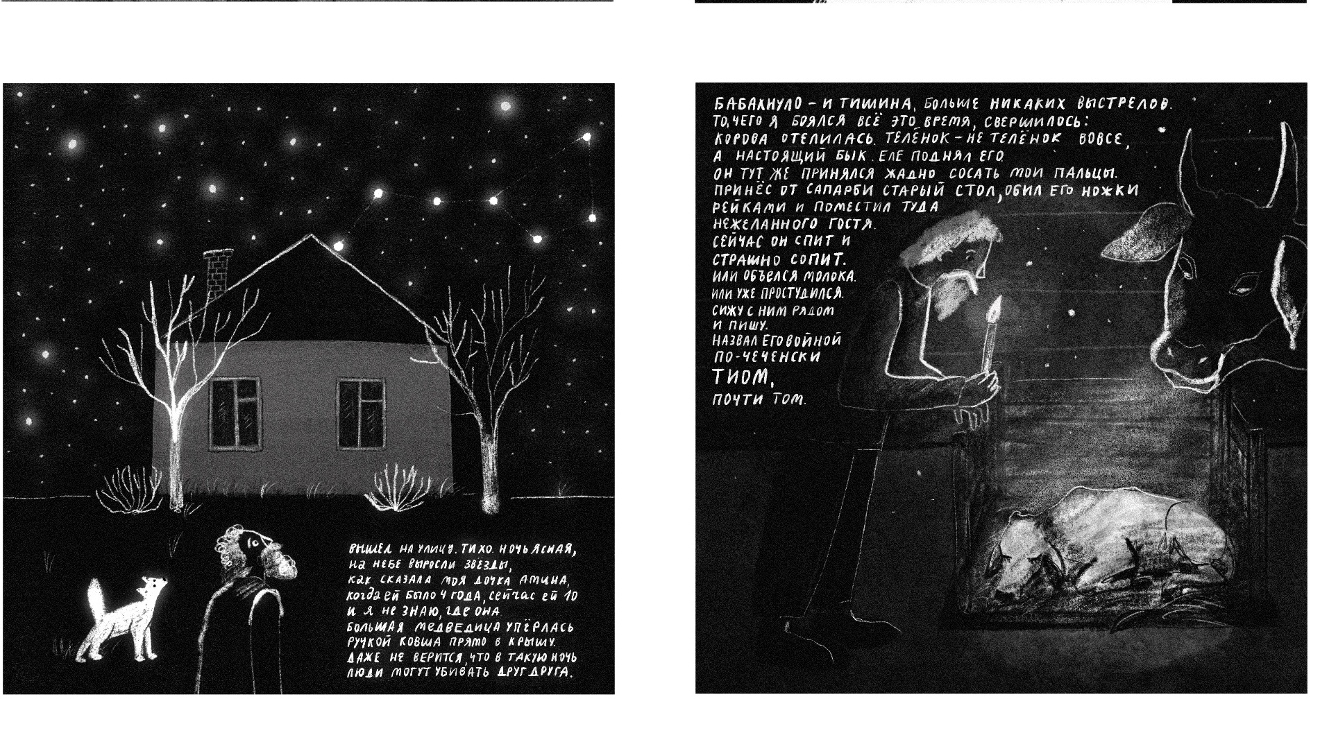 Возвращаюсь к чеченским дневникам. Их автор Султан Яшкуркаев, живя в деревне под Грозным, во время войны умудряется сохранить чувство красоты в себе. Для меня это очень поэтичный текст, если уместно здесь использовать такое слово. Несмотря на описание жизни во время войны, я почуяла там какой-то внутренний свет. Читала и живо представляла себе, как автор этого дневника выходил на улицу ночью, как принимал роды у коровы и оберегал телёнка. Как он замечал красоту. И некоторые иллюстрации вышли соответствующие. Если не вчитываться в тексты, то может показаться, что мы рассказываем сказочку. Там местами такой неземной свет. Свечки, звёздочки, искорки. Есть какое-то волшебство, действительно. Но в то же время на контрасте идут записи о страшных событиях, которые разрушают жизнь.