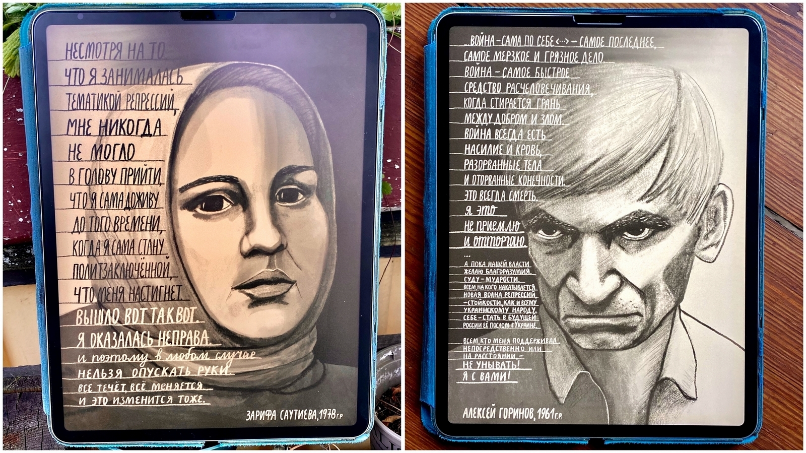 Сейчас работаю над еще не изданной книгой. Точнее, первая ее редакция вышла в 2022 году, но на итальянском и без иллюстраций. Она называется "Сохрани мою речь", а это – портреты для русско-английской версии, которая ещё готовится. В книге собраны последние слова с судов – речи тех, кто подвергся и подвергается политическим преследованиям. На данный момент я нарисовала 24 портрета, вероятно, их будет чуть больше. Среди них есть Саша Скочиленко, Вика Петрова, Алексей Горинов, Юрий Дмитриев, Азат Мифтахов, Алексей Навальный, четверка ребят из DOXA. Тоже очень важный и значимый для меня проект.