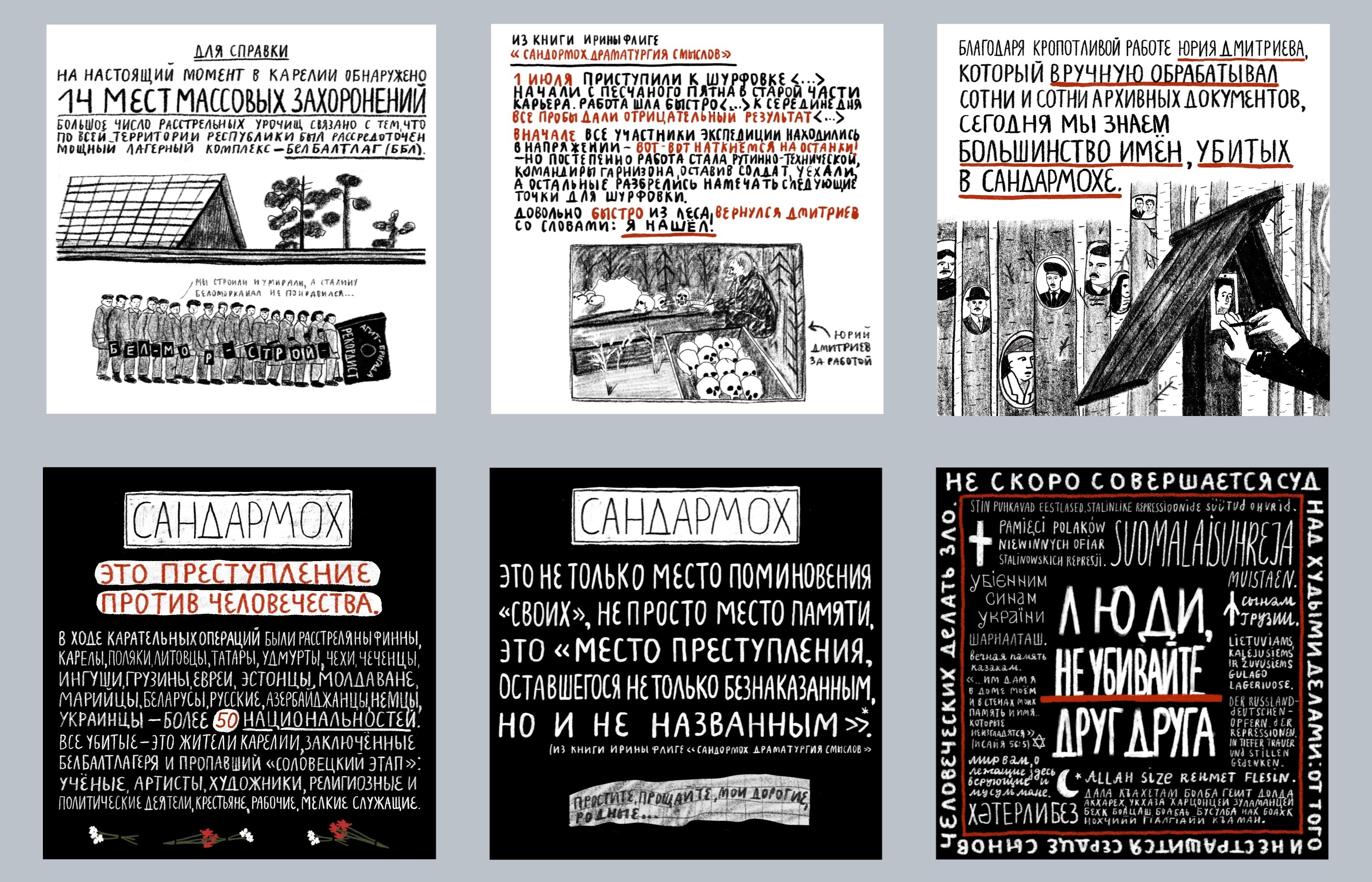 5 августа – международный День памяти жертв Большого террора в СССР. Обычно в этот день многие едут в Сандармох, также читают имена – списки расстрелянных в Сандармохе, как на "Возвращении имен" 29 октября. Я нарисовала эти иллюстрации, чтобы рассказать историю этого места. Параллельно в это же время участвовала в выставке в Праге про Сандармох и Юрия Дмитриева.